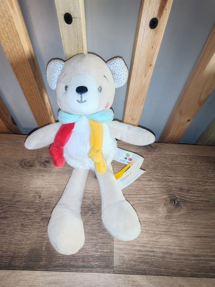 Doudou ours blanc bleu rouge jaune Lulu & Mael P'TIT BISOU Tbe Étiquette marque présente 9.90.euros Envoi en relais