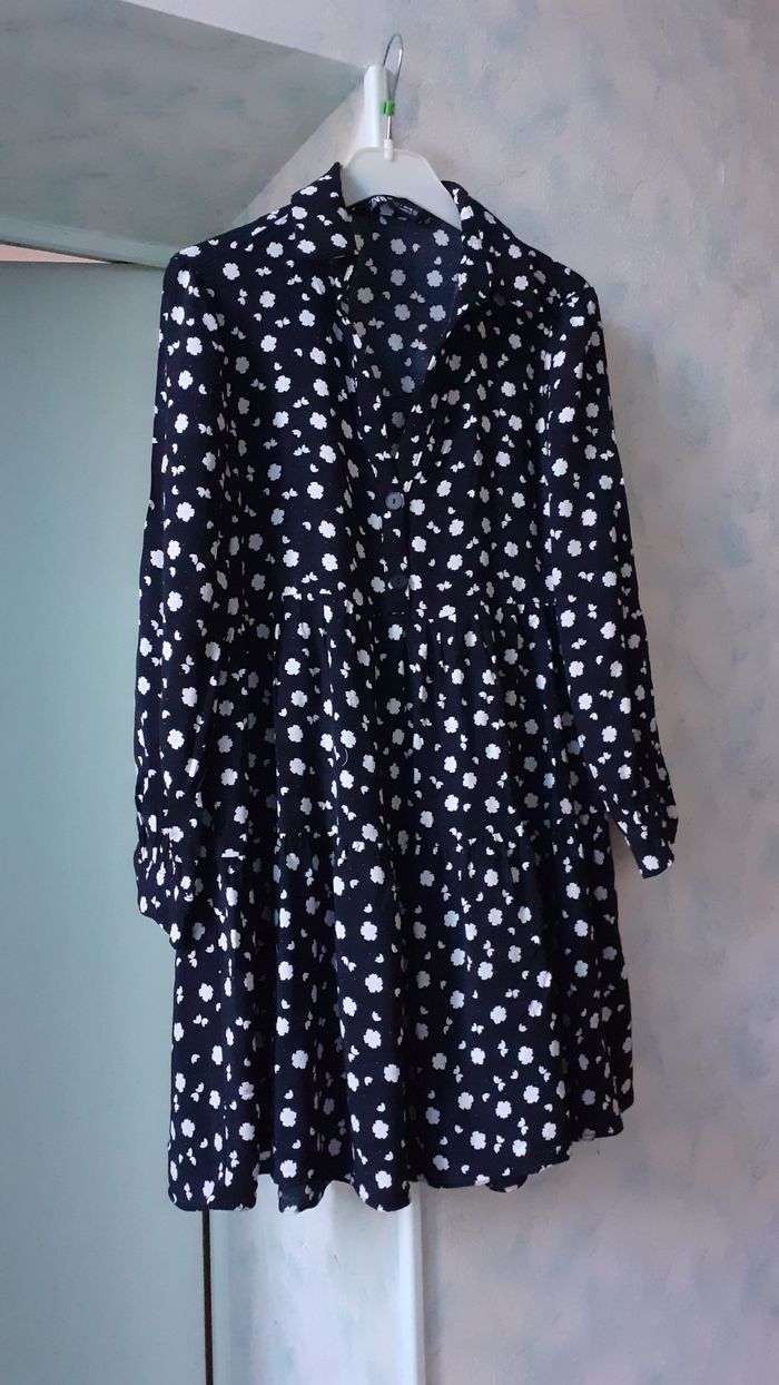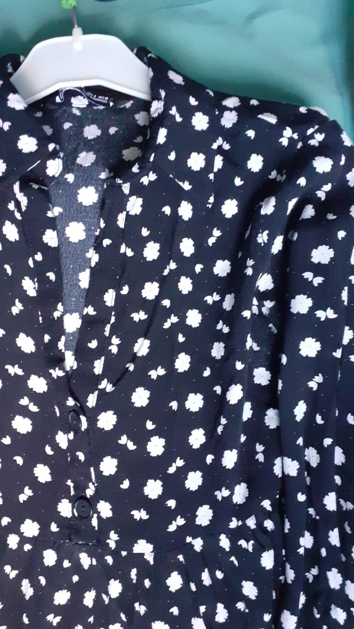Vends une tunique manches longues 100 % viscose, boutons sur le buste qui est ajusté et forme évasée, couleur noir avec petites fleurs blanches, marque Zara, taille S. Longueur de l'épaule à la base : 77 cm Largeur aisselle à aisselle : 42 cm.
