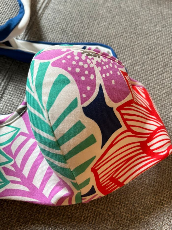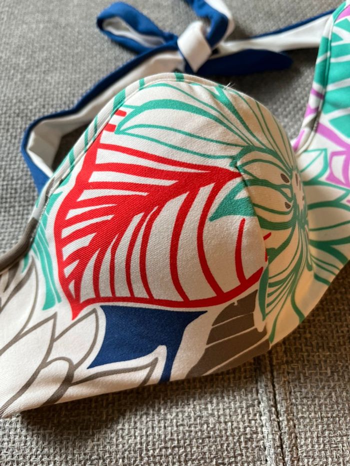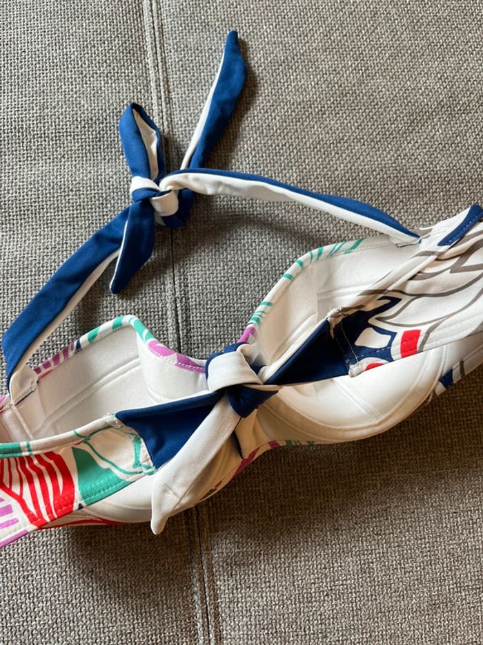 Haut de maillot de bain forme bandeau coqué (coques non amovibles), à nouer autour du cou, et à nouer dans le dos Marque Hechter mais étiquette coupée Taille 90B Neuf, jamais porté