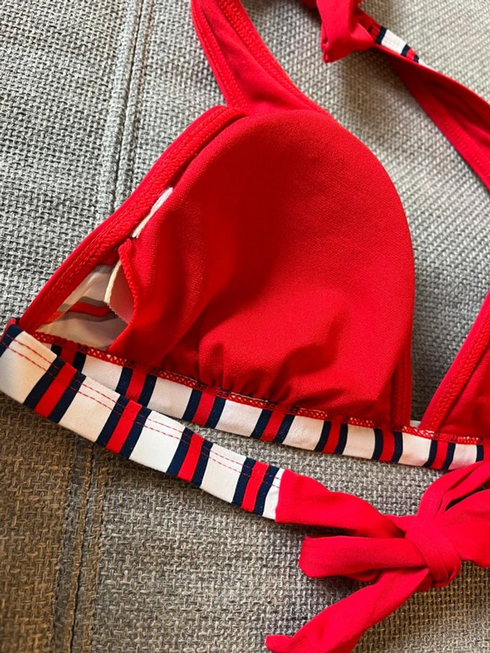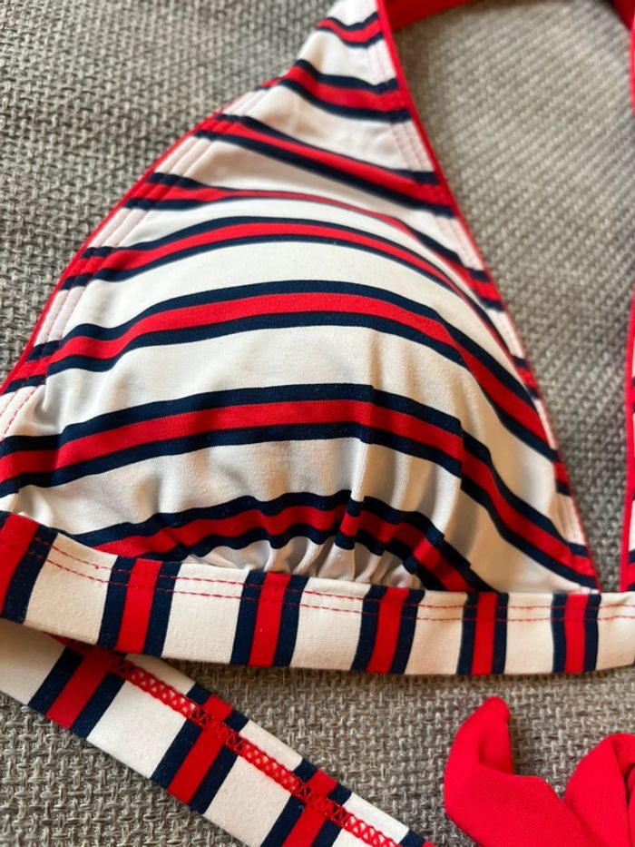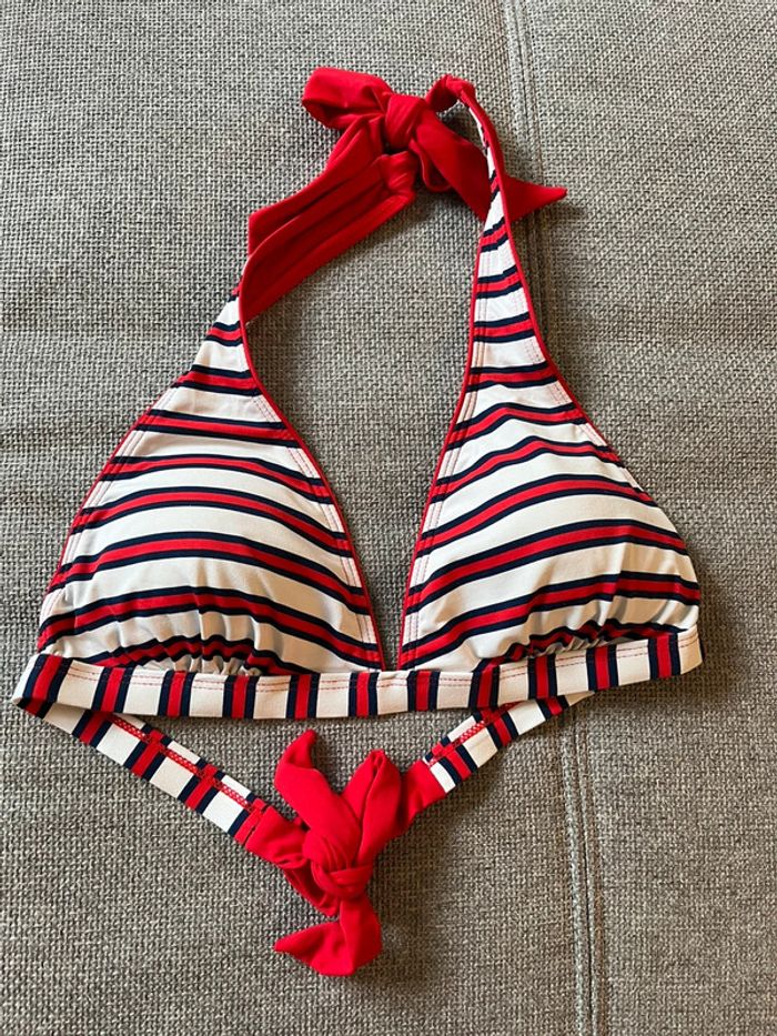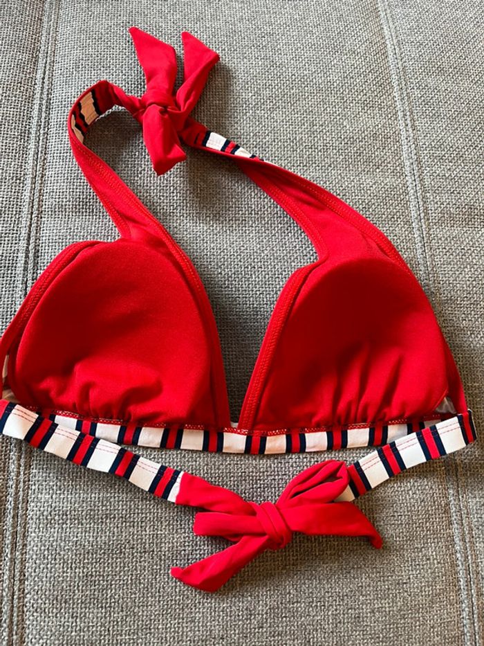 Haut de maillot de bain forme triangle S’attache autour du cou et dans le dos (à nouer) Coque amovibles Coloris : rouge, bleu marine, blanc Neuf, Jamais porté (étiquette coupée)