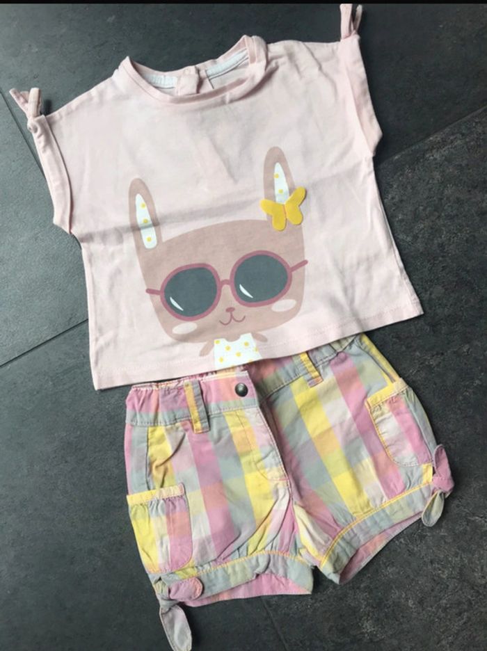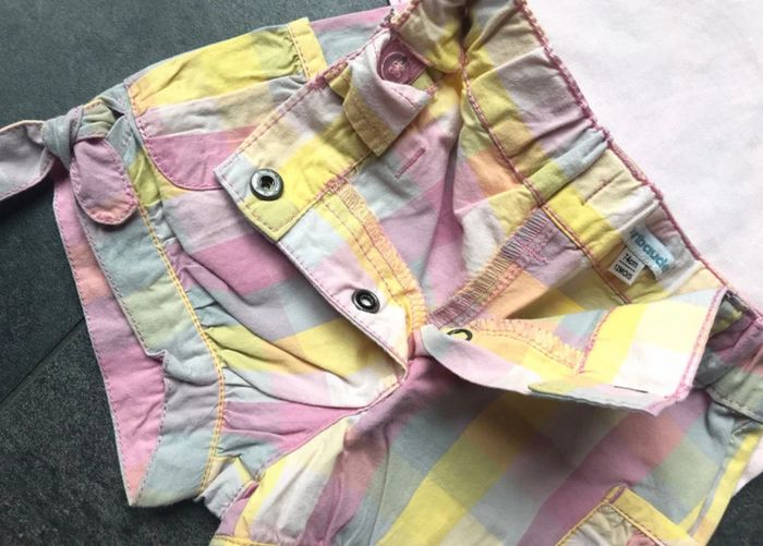 Ensemble Vertbaudet 12 mois -74 cm fille - 1 short à carreaux taille ajustable - 1 t-shirt manches courtes motif devant et petits noeuds sur les manches #petchou94