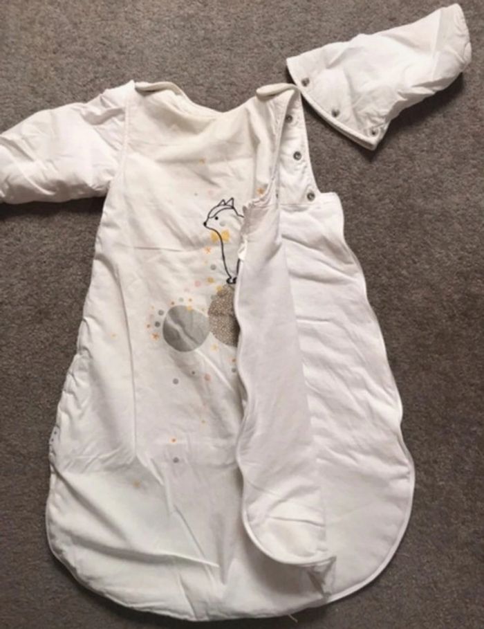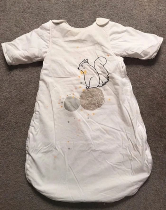 Gigoteuse chaude Vertbaudet 0-6 mois Les manches sont amovibles A noter : Le tissu a légèrement jauni au niveau du col (voir photo) sinon en très bon état Gigoteuse mixte !
