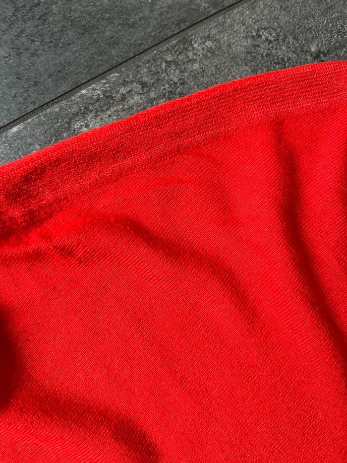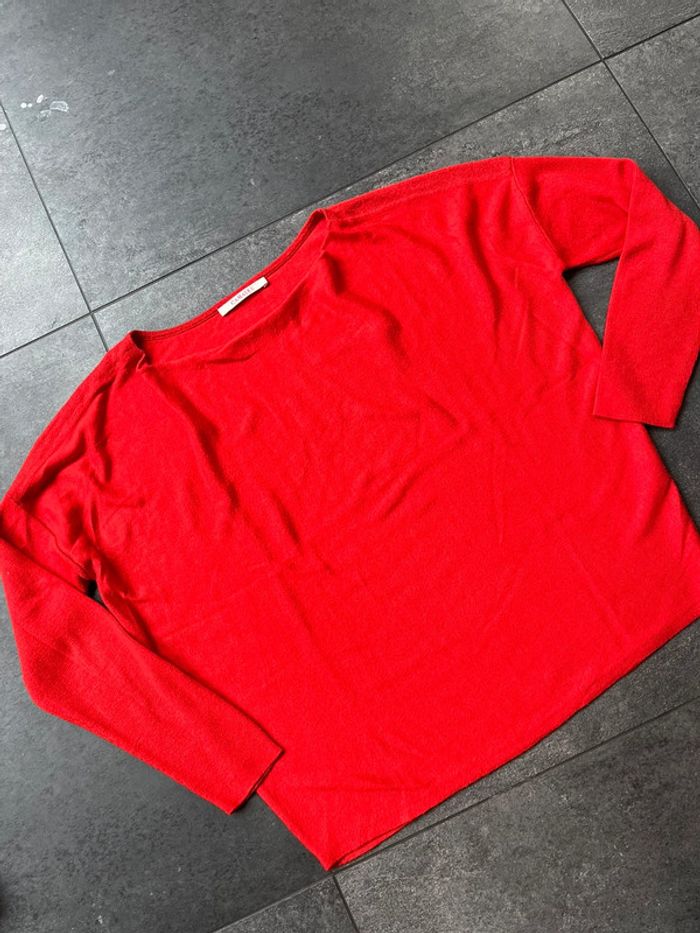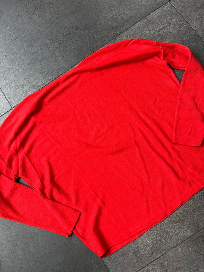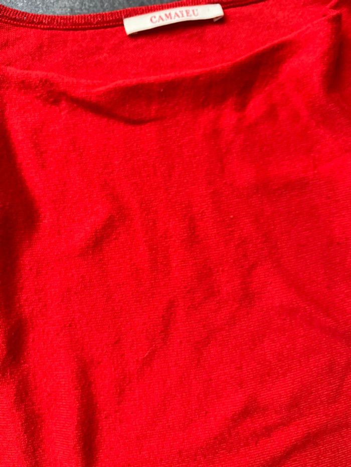 Pull rouge Camaïeu taille XS Beau rouge (moins vif qu’en photo) Composition : 50 % polyester, 49 % viscose, 1 % fibres métallisées (au niveau des épaules) Un peu bouloché