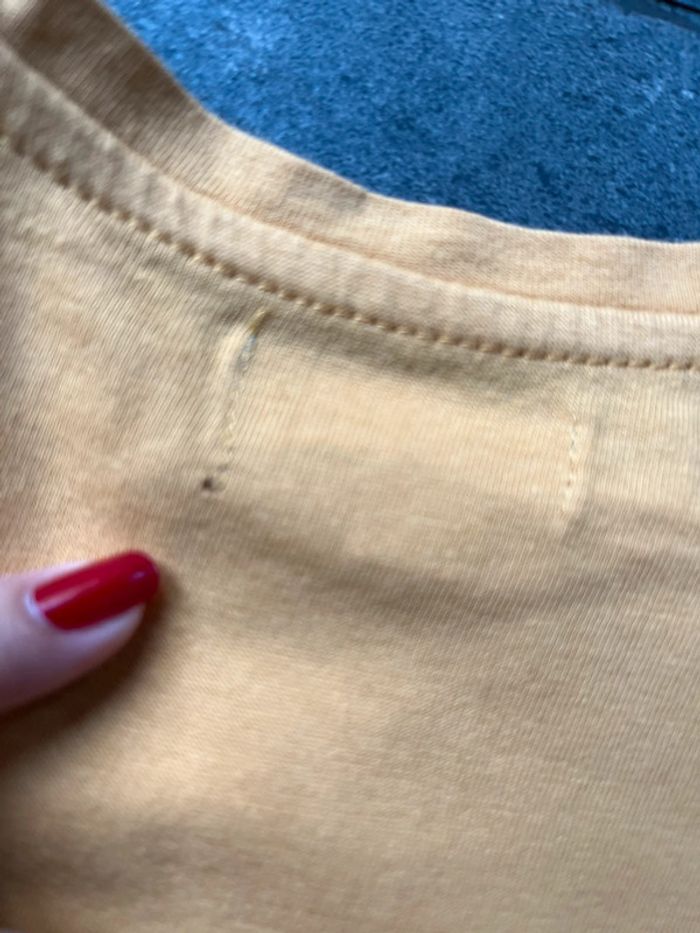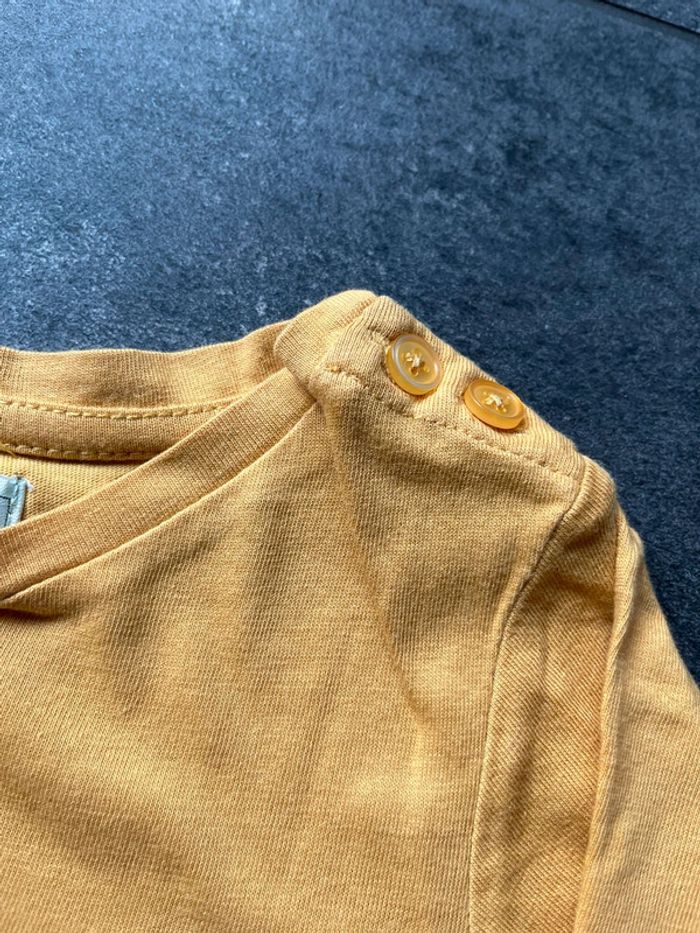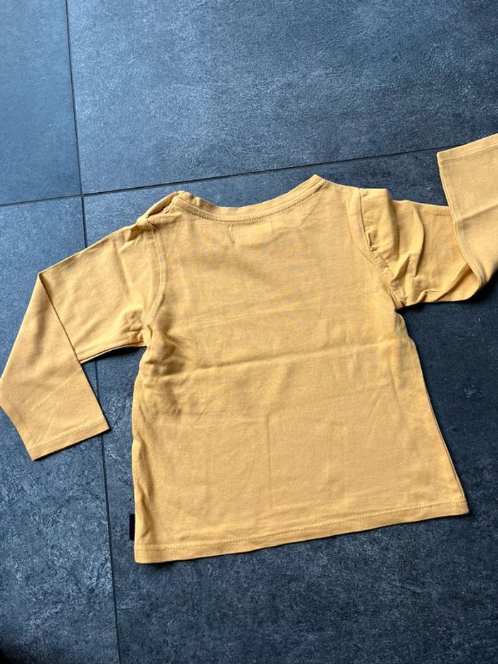 T-shirt manches longues, taille 3 ans, 36 mois 95 cm. Couleur jaune moutarde. À noter : petit trou au niveau de l’étiquette au dos du T-shirt. Deux petits boutons sur le côté du col pour permettre l’enfilage plus facilement. Marque Mes petits cailloux .