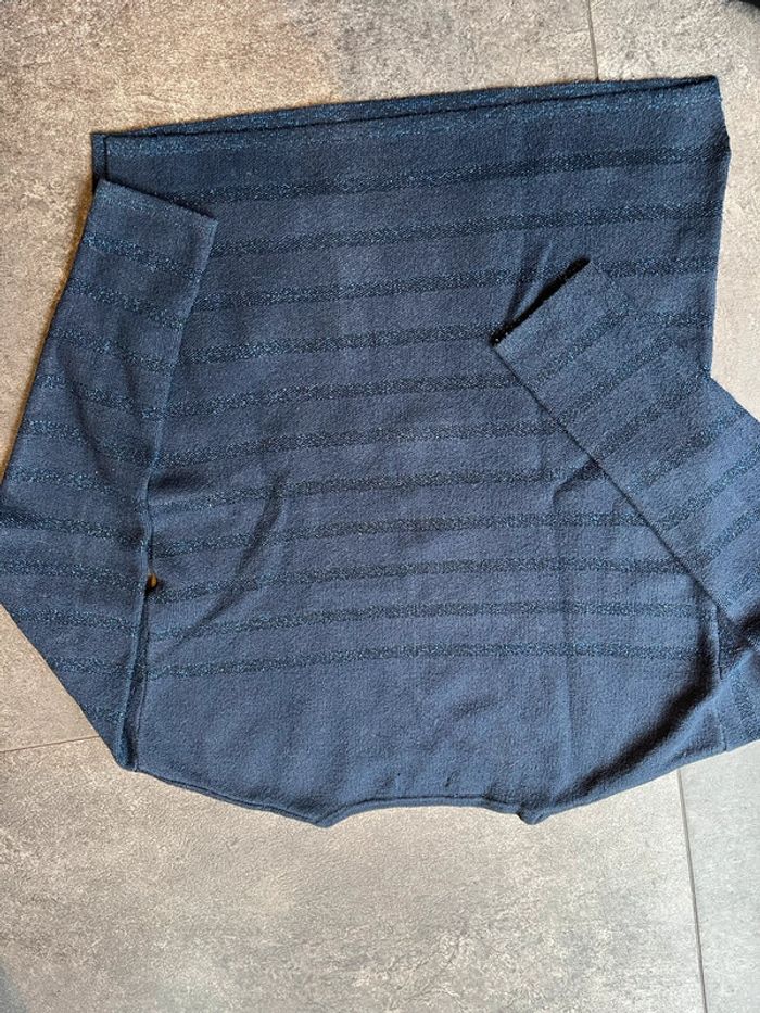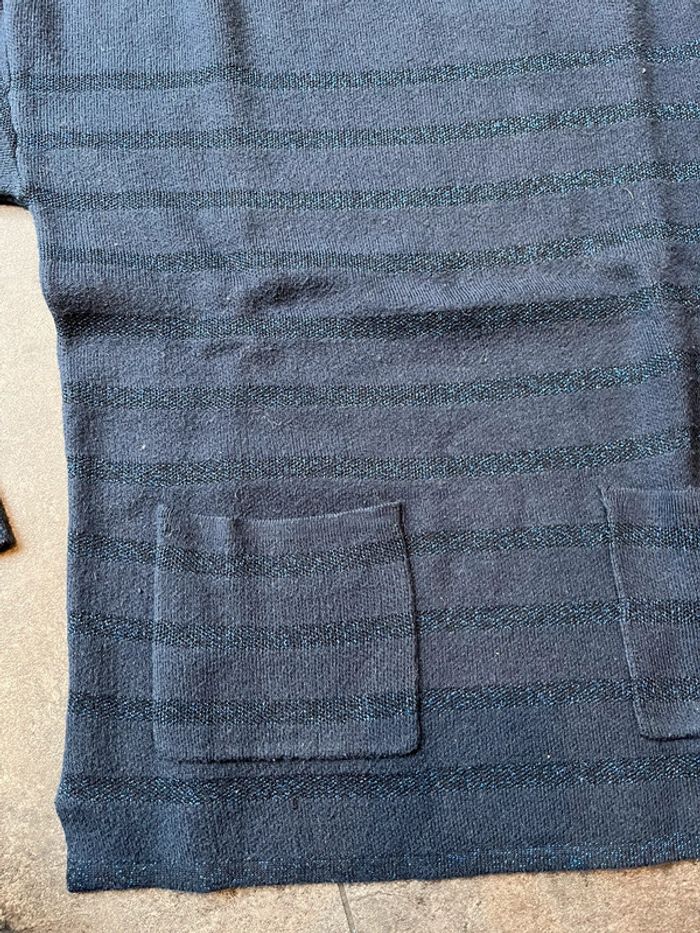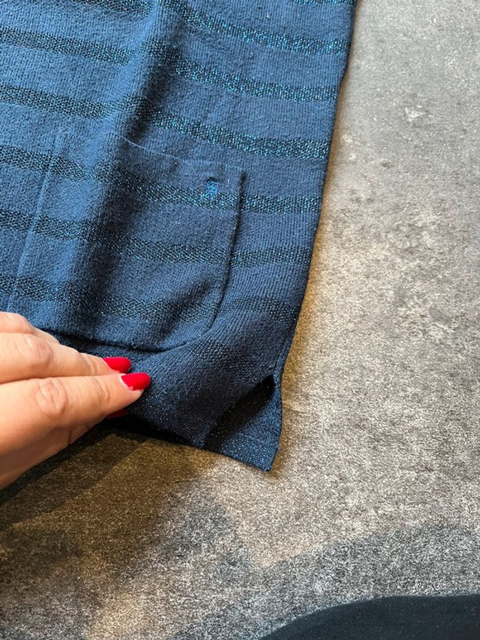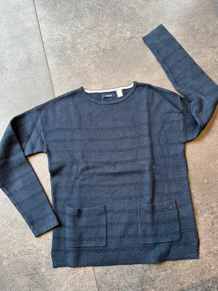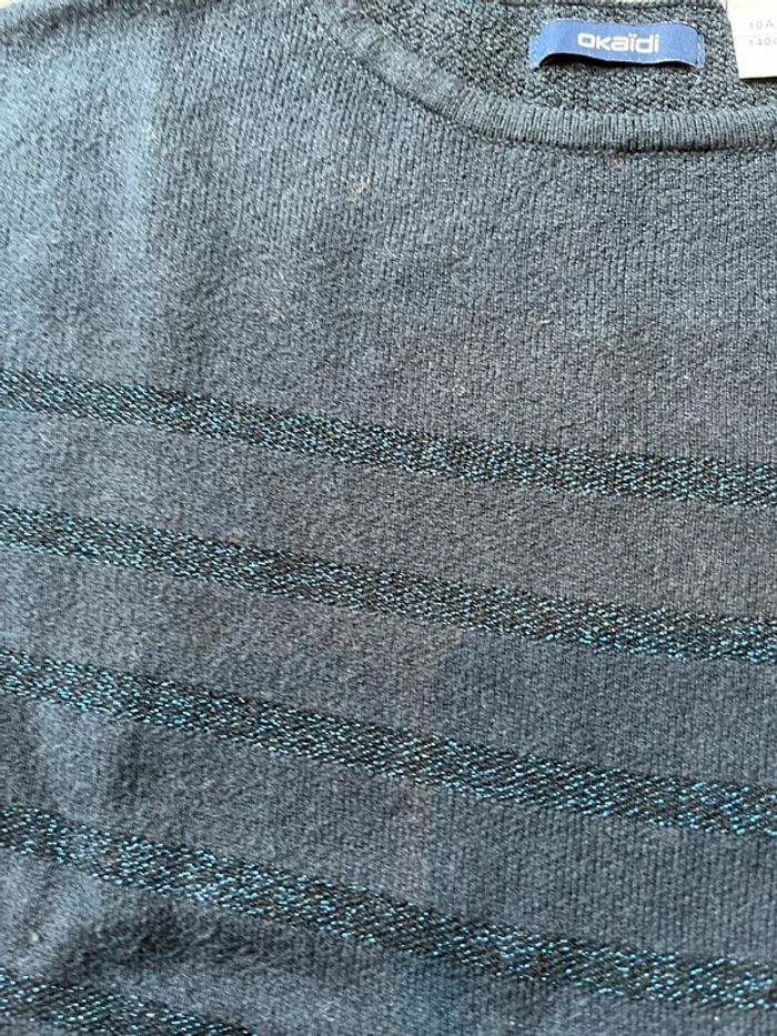 Pull Okaidi taille 10 ans (140 cm) Bleu marine à rayures bleu en lurex (type pailleté) Avec 2 poches plaquées à l’avant Petites fentes sur les côtés 59% coton - 30% polyamide - 7% polyester - 4% fibres métallisées