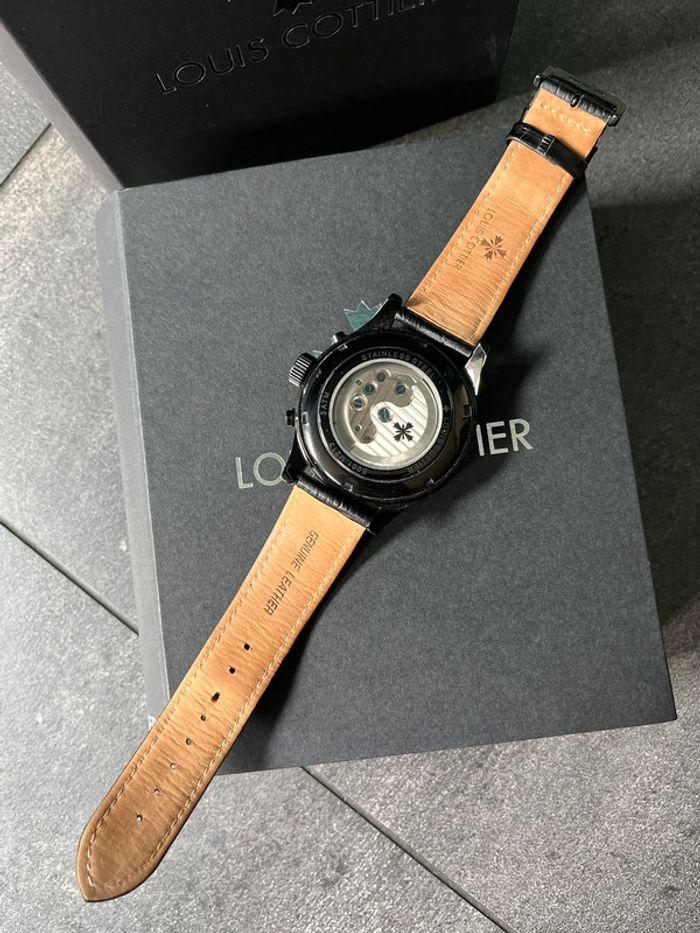 Montre automatique Louis Cottier « Atlantis » - Bracelet cuir - Mécanisme automatique - Matière du boîtier : PVD - Cadran : environ 48 mm - Bracelet et boîtier coloris noir - Vue sur le squelette à l’arrière Prix neuf : 1250€