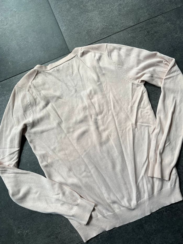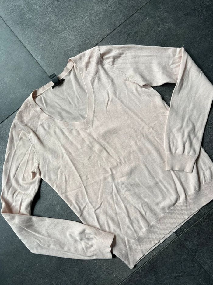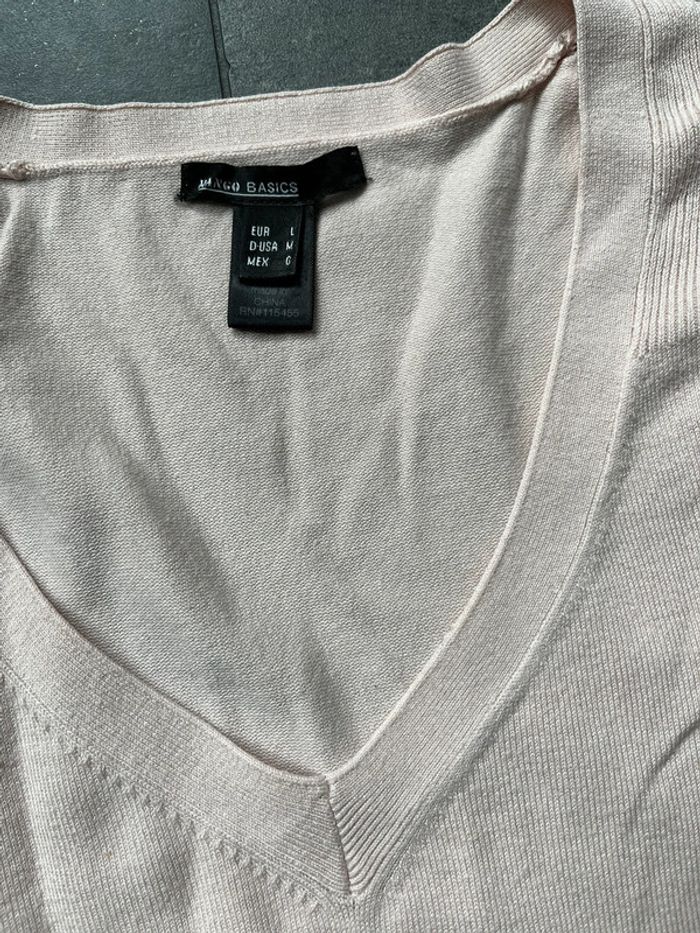 Pull Mango col V coloris beige rosé Taille L (Je trouve que ça taille petit) Composition : 49% viscose - 31% coton - 15% polyamide - 5% elasthanne