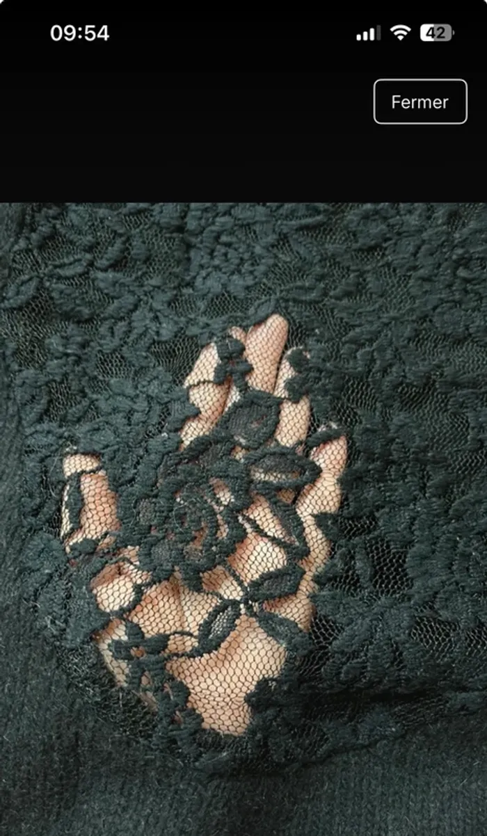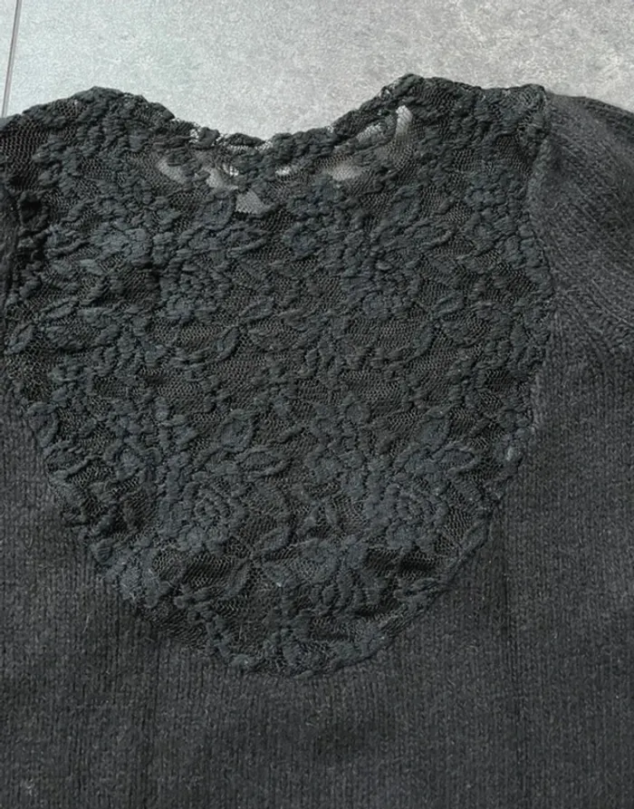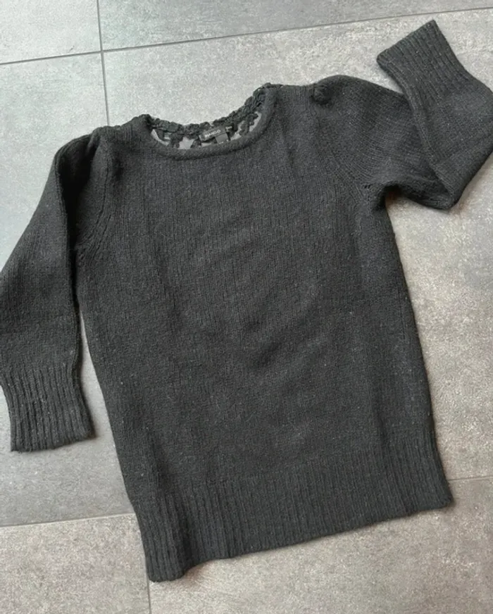 Pull noir dos dentelle Manches 3/4 Mango taille S Composition : 67 % polyamide, 19 % angora, 14 % Laine Applique dentelle : 94 % polyamide, 6 % élasthane #petchou94
