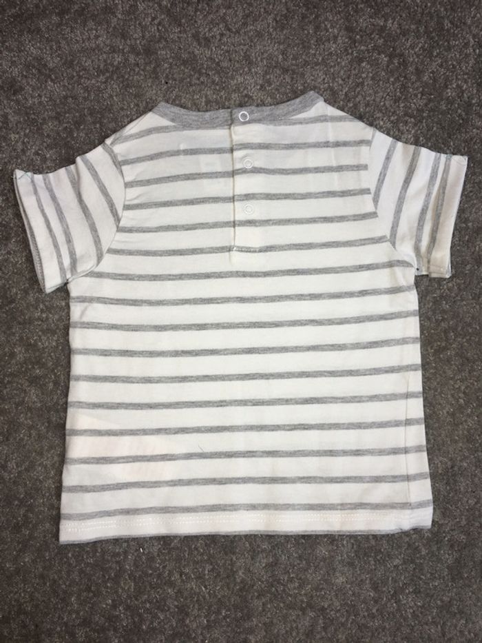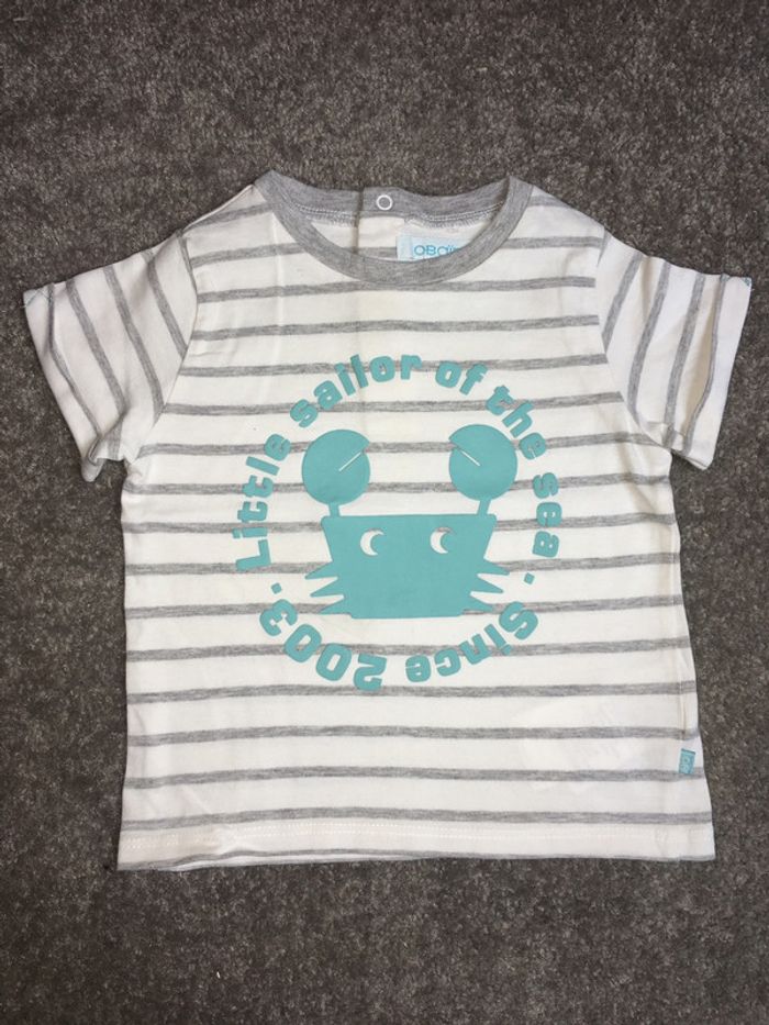 T-shirt manches courtes Obaibi Taille 9 mois - 71 cm Blanc à rayures grises et à imprimé bleu-vert Ouverture 3 pressions au dos #petchou94