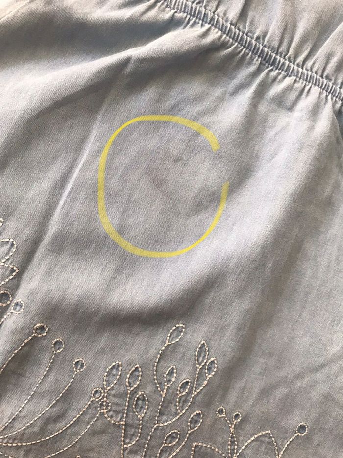 Robe d’été Vertbaudet taille 6 ans - 114 cm Bleu jean clair avec jolies broderies blanches A noter : petit fil tiré à l’avant et légère tâche à l’arrière (voir photos) #petchou94
