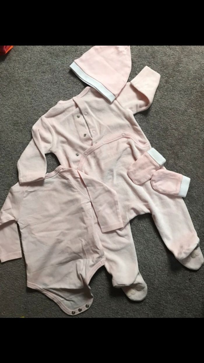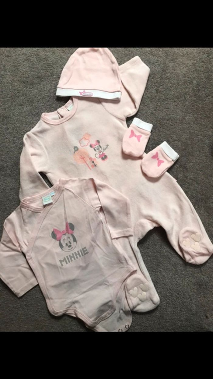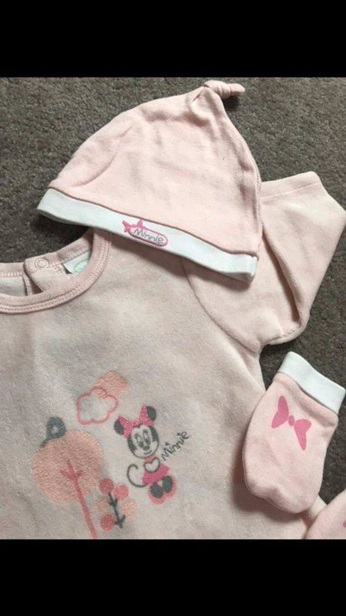 Ensemble bébé fille Minnie 3-6 mois 1 grenouillère velours 1 body 1 bonnet 1 paire de mouffles coton #petchou94