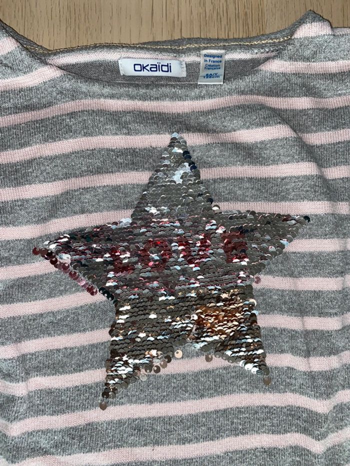 Pull léger fille 8 ans okaidi rayures gris rose étoile sequins - photo numéro 1