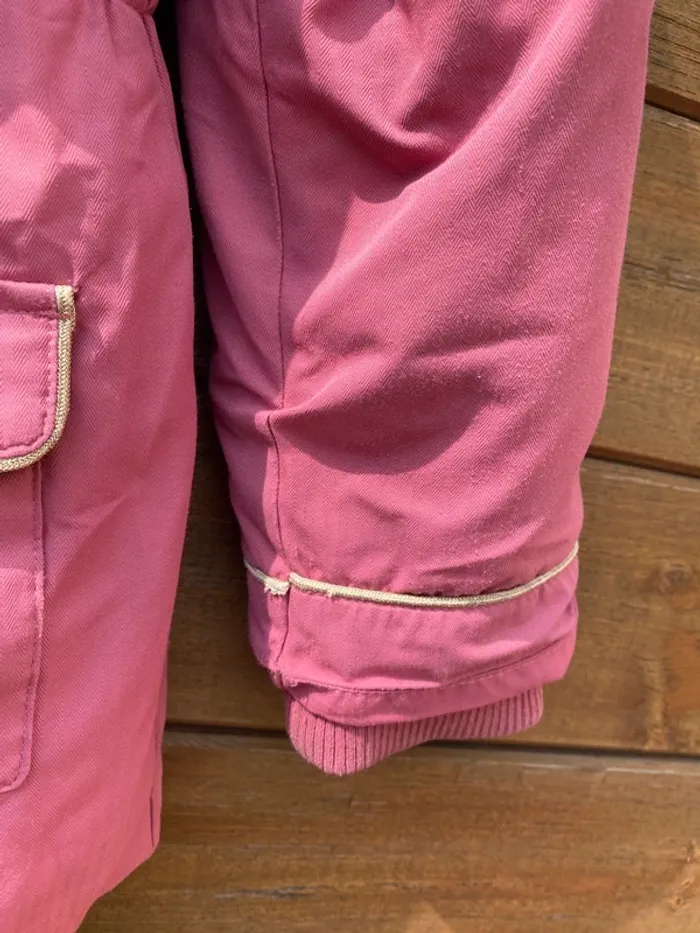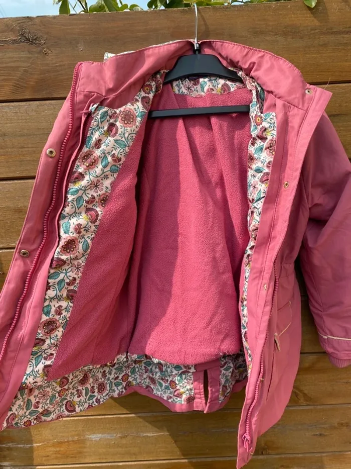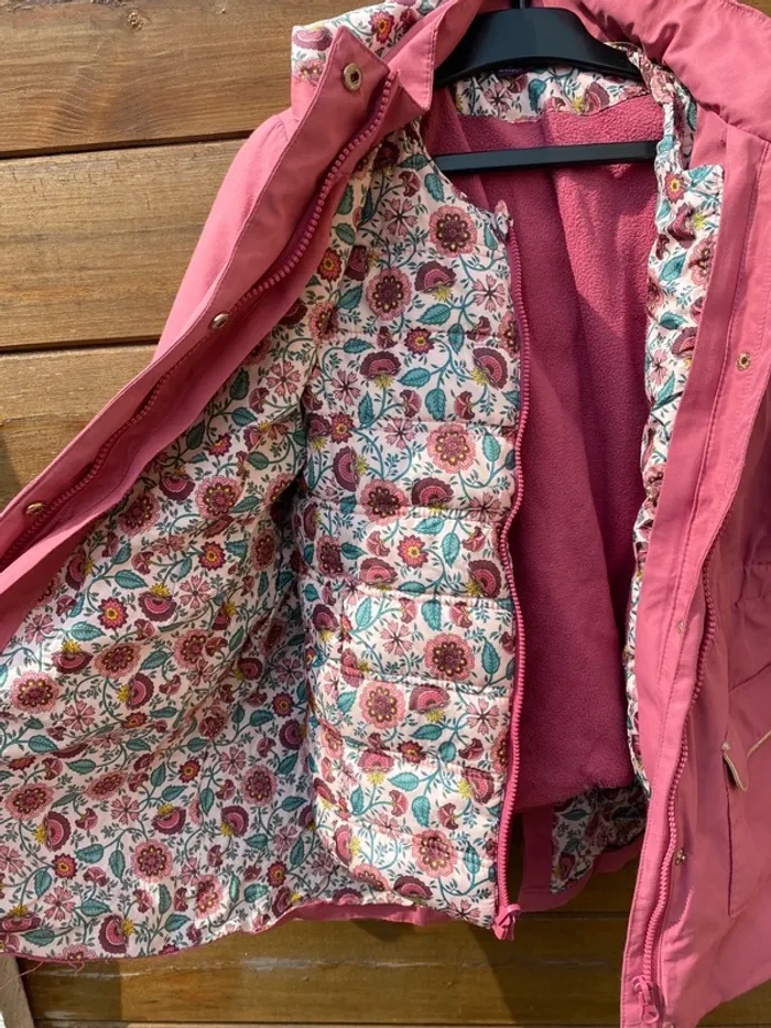Il y a le parka imperméable rose parfait pour le printemps et l’automne, dans lequel on peut accrocher un blouson mi saison. L’alliance des 2 permet d’avoir un manteau bien chaud pour l’hiver !