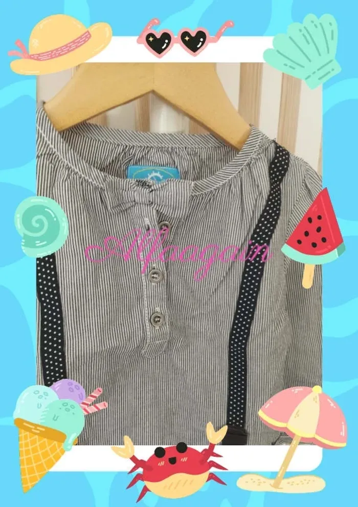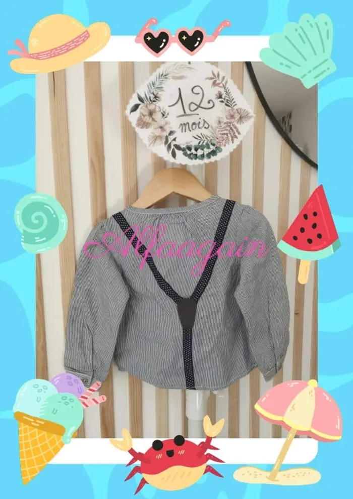chemise bleue rayée avec bretelles brodées et noeud papillon col boutonné. Neuve lavée. Taille 12mois A vendre 5€ NON NÉGOCIABLE --------------------------- ✏️Informations générales ✏️ 📩Expédition dans la journée en général -hors weekend. 🚭Maison non fumeur / sans animaux 📅Pas de réservation 📸Pas de photo porté 👛 Bon plan Envoi à 99ct (+20% récupéré en bon d'achat) possible uniquement pour les français- me contacter pour plus d'infos 😉 #alfaagain12moisfille