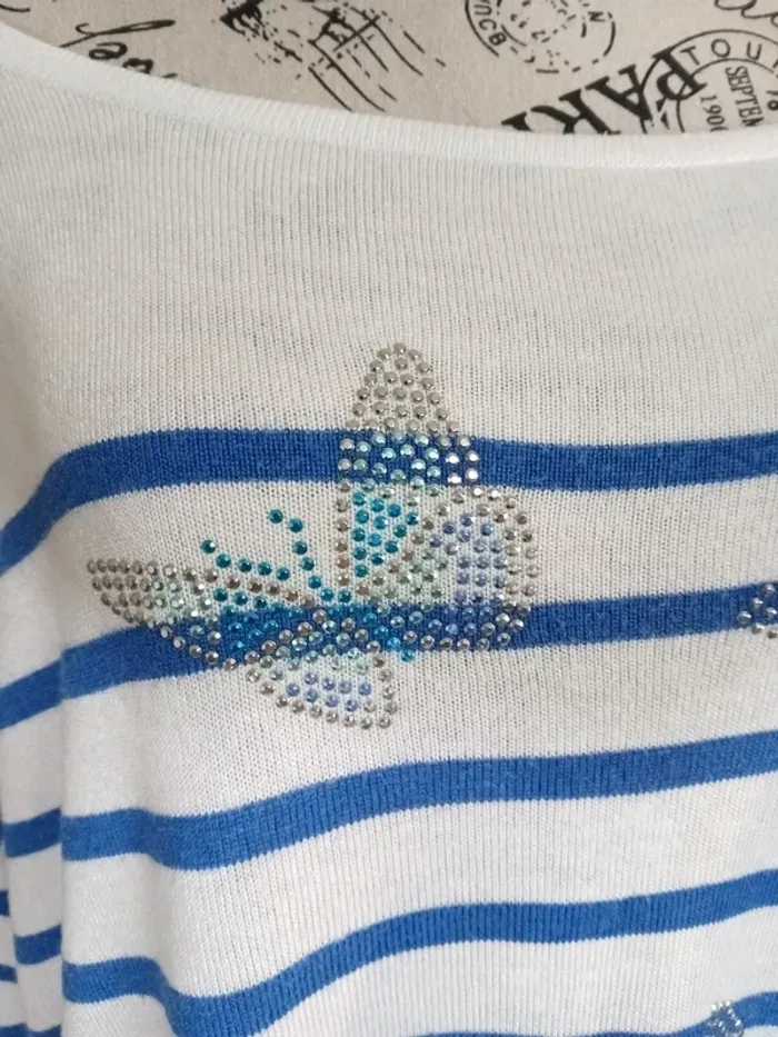 🦋 Pull blanc & rayé bleu – Motif papillon strass – Riu – Taille 44/46 - photo numéro 2