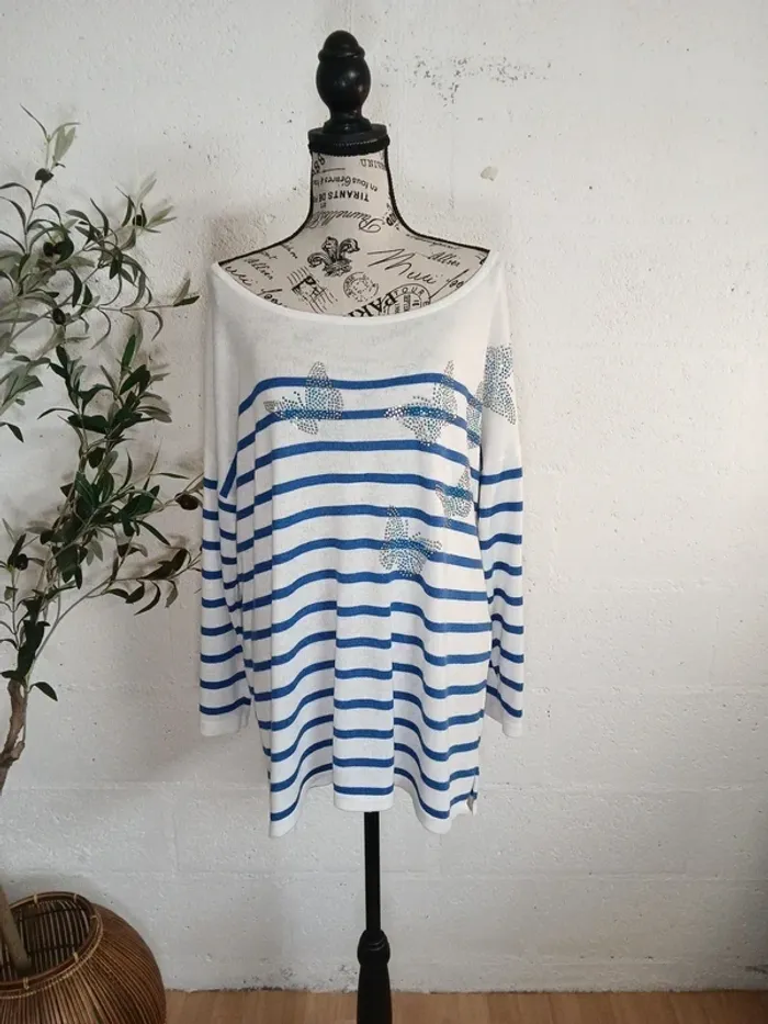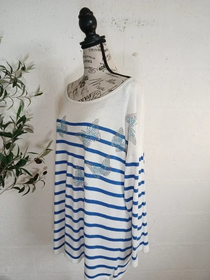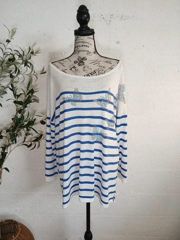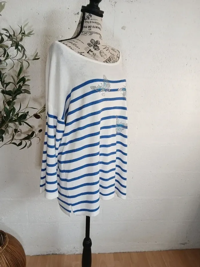 🦋 Pull blanc & rayé bleu – Motif papillon strass – Riu – Taille 44/46 - photo numéro 1