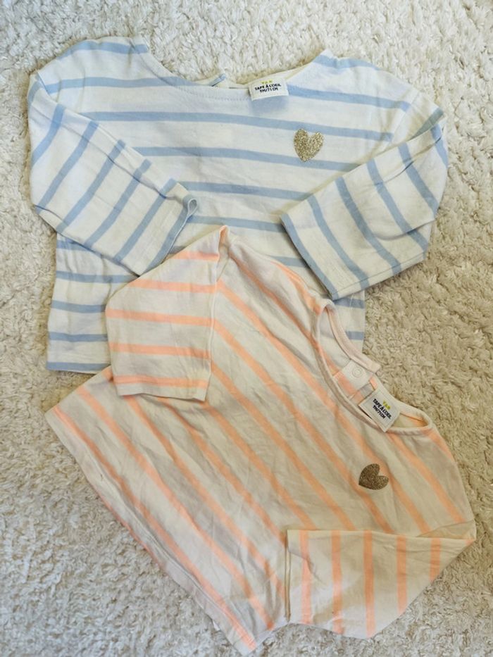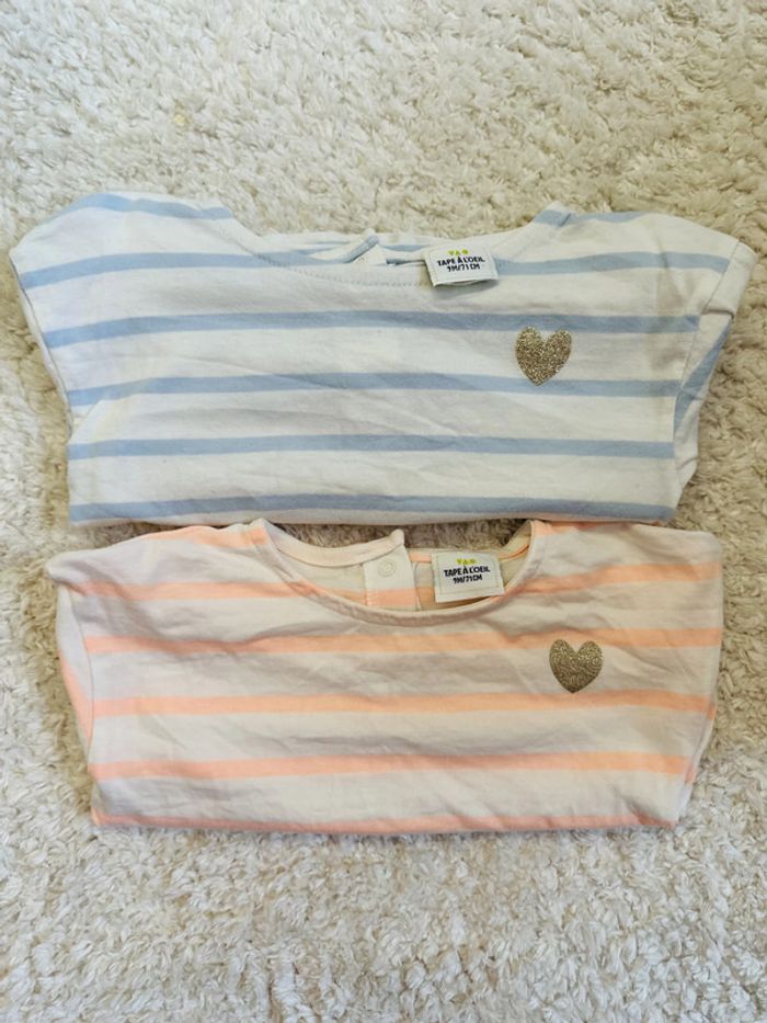 Lot de 2 t-shirts manches longues marinières 9 mois de chez Tape à l'oeil, détail petit coeur doré. Excellent état. Collection actuelle. #9mois #9moisbebe #9moisbebefille #tao #taobebefille
