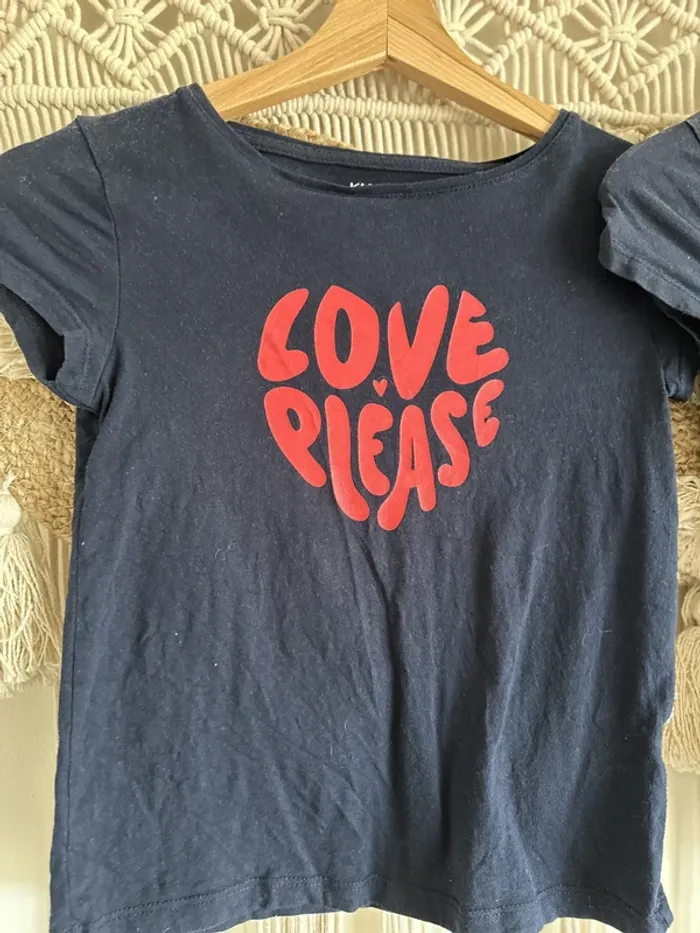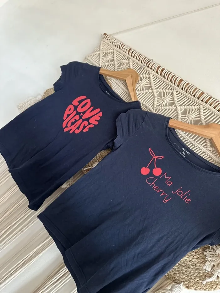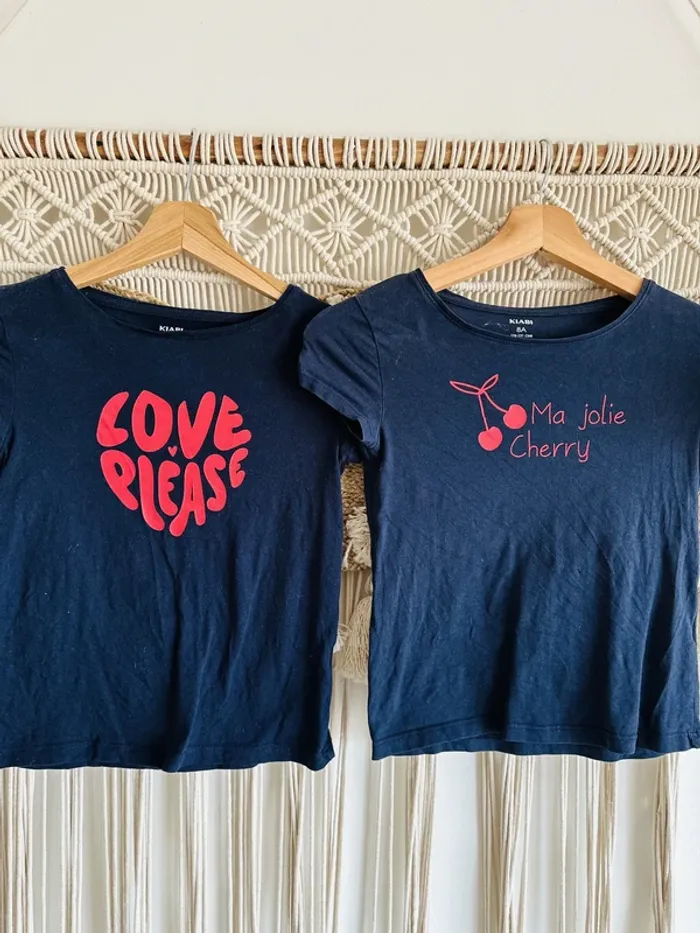 Lot de 2 t-shirts bleu marine avec inscriptions rouge 8 ans, celui de droite a un petit trou (voir 3ème photo) #8ans #8ansfille #lot #lot8ansfille #lotfille8ans #amour