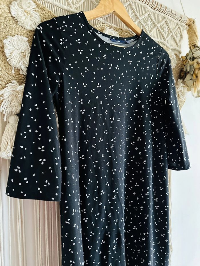 Petite robe noire fluide à motifs blanc, fluide, très agréable à porter. Taille S. Excellent état #robenoire#robenoire#robenoire #petiterobenoire #robenoirefluide #robeimprimée