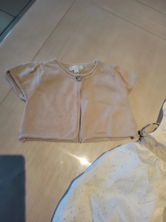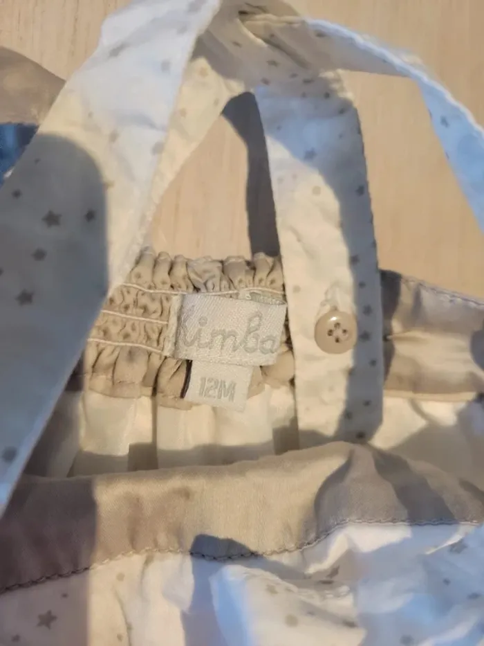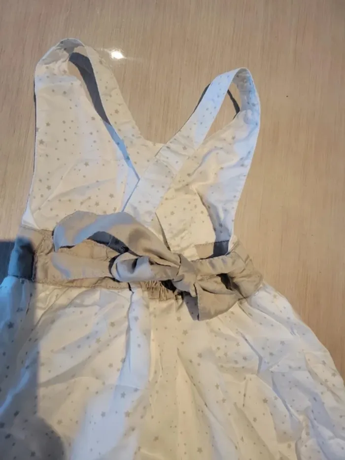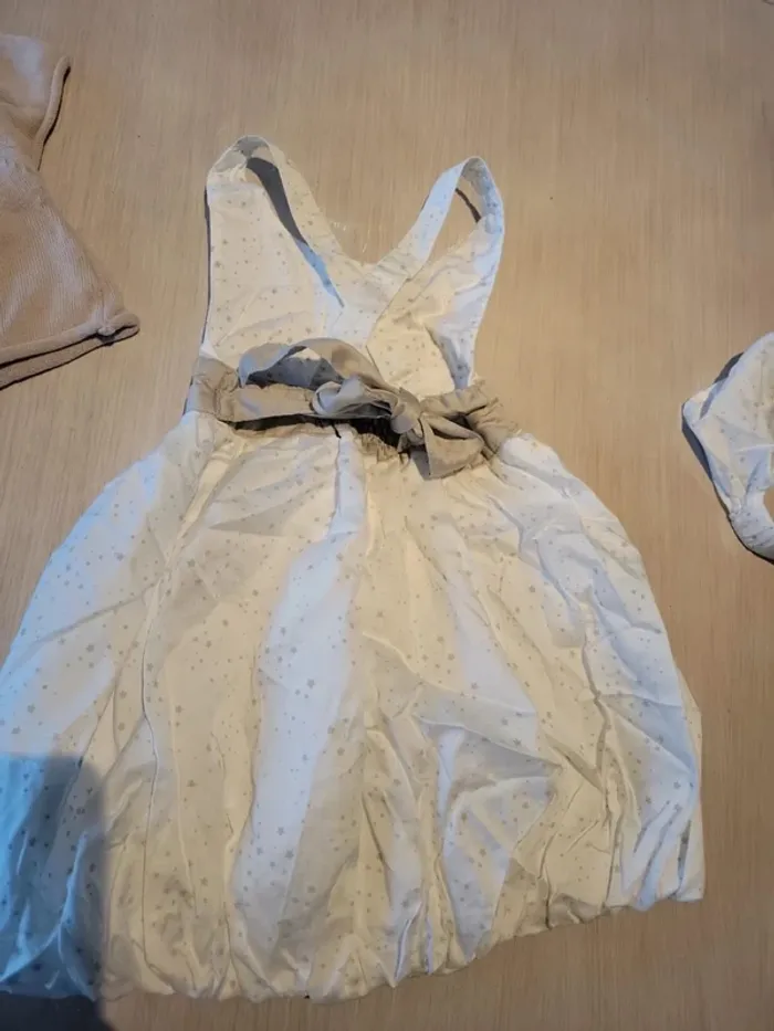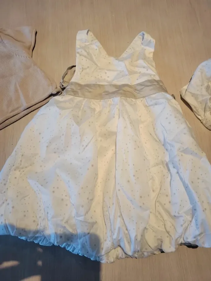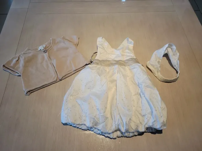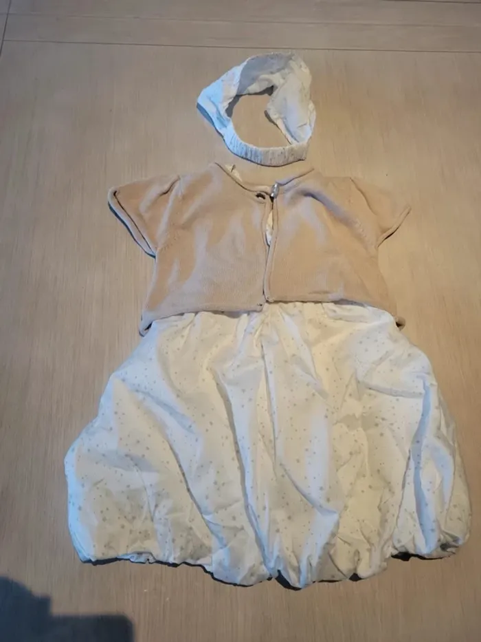 Ensemble robe, veste manches courtes et "serre tête" Kimbaloo. Taille 12 mois. Couleur blanche avec motif étoile. Veste couleur lin. Très bon état #33coco_fille12mois.