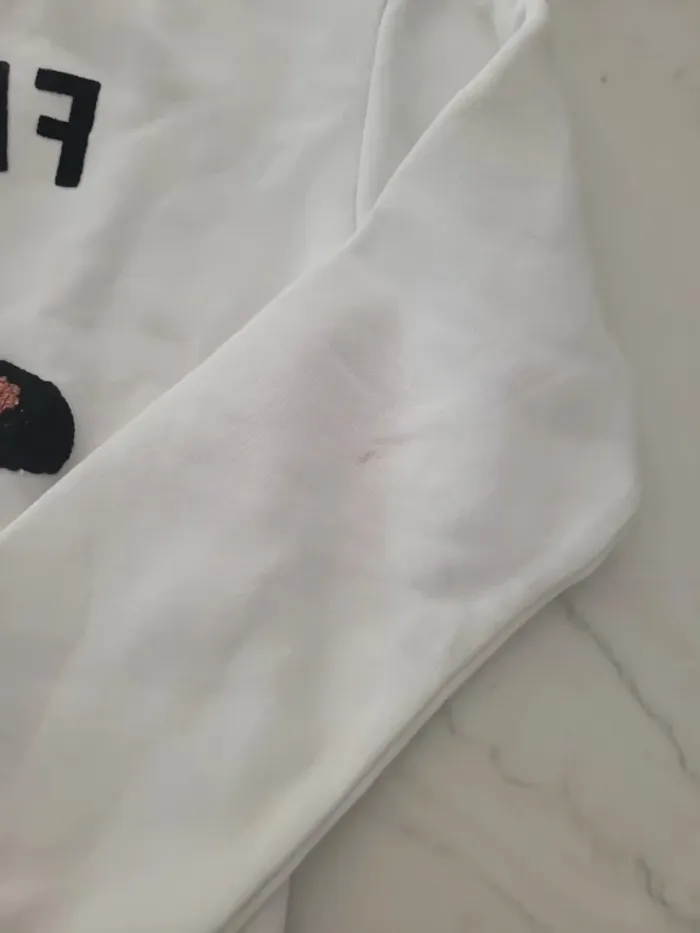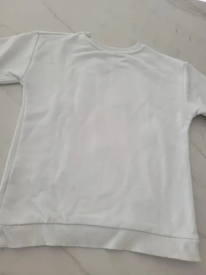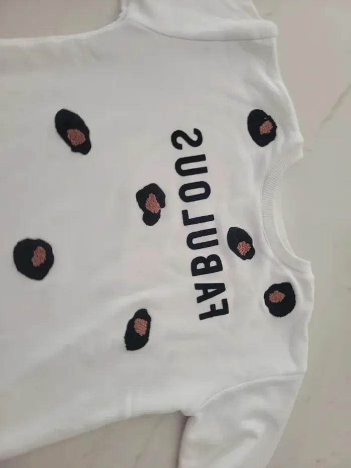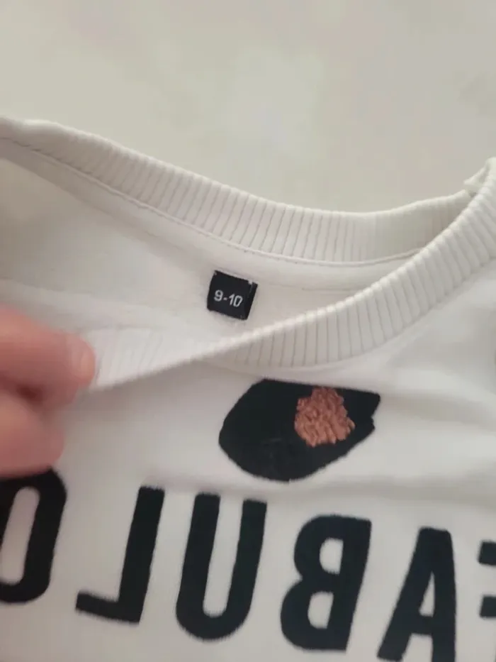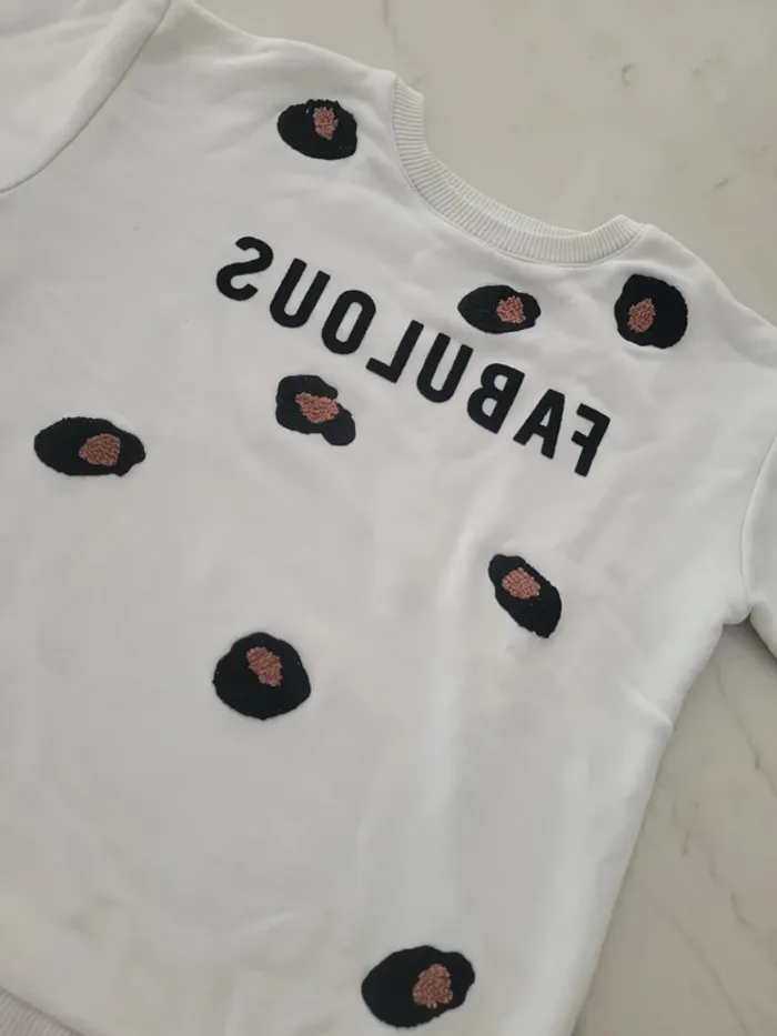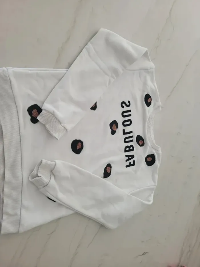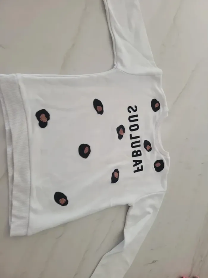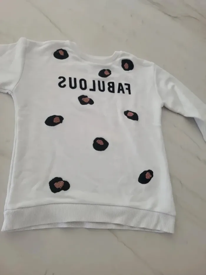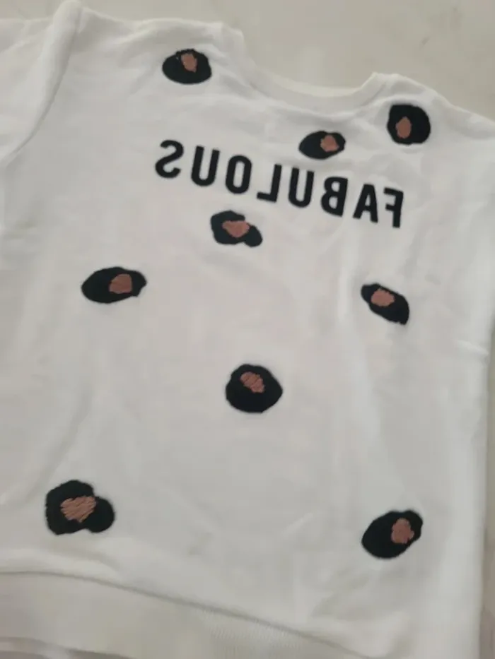 Sweat pull fille Fabulous. Blanc motifs noir et marron. Taille 9-10 ans Bon état (1 petite tâche à la manche et 3 dans le dos, voir photos). #33coco_fille9ans #33coco_fille10ans