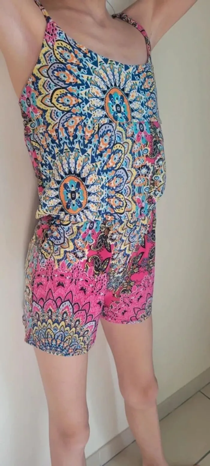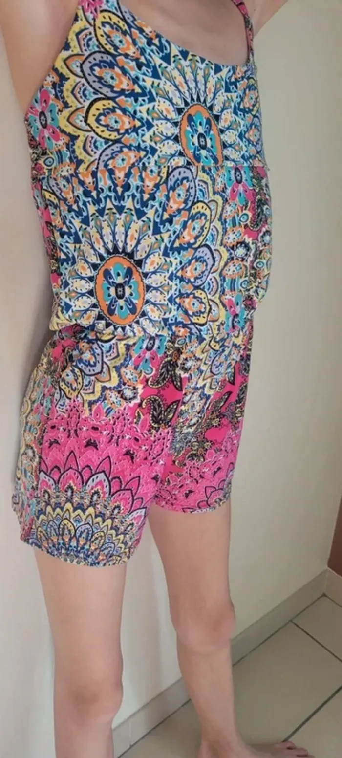 Combinaison short été fille colorée. Taille 8 ans. Légère, à bretelles. Élastiquée à la taille. Sans marque. Très bon état #33coco_fille8ans