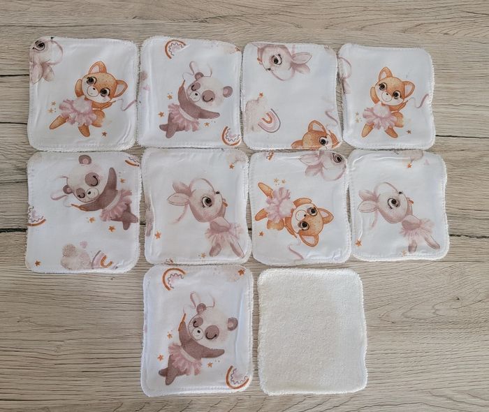 ☆☆ Lot de 10 lingettes éponge bambou ☆☆ Lingettes lavables par lot de 10. Elles sont fabriquées en coton oeko-tex. L'éponge est en bambou, très douce et résistante avec un grammage élevé pour un tissu simple d'où une bonne tenue et une bonne absorption. Nouvelle qualité : encore plus douce et plus résistante. L ensemble est certifié Oeko-Tex (sans substances chimiques susceptibles de nuire à la santé). Taille de coton vendus en grande surface, environ 10cm\9cm. Possibilité de créer en d autres tissus, d autres matières... Lavable en machine à 30 degrés. Idéales pour la toilette, le change de bébé. Le débarbouillage de bébé. La démaquillage de la maman... Pour tout autres renseignements veuillez me contacter.