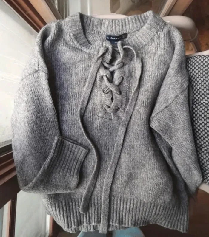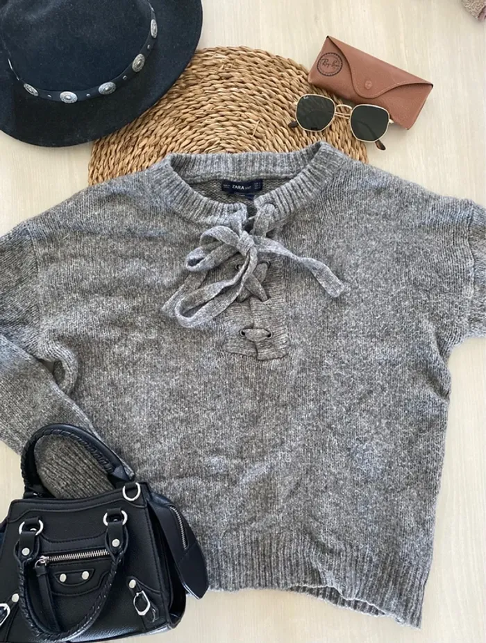 Pull gris maille à gros lacets à nouer au col. Taille s