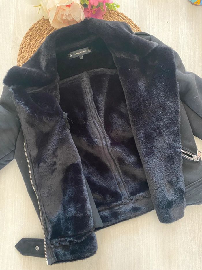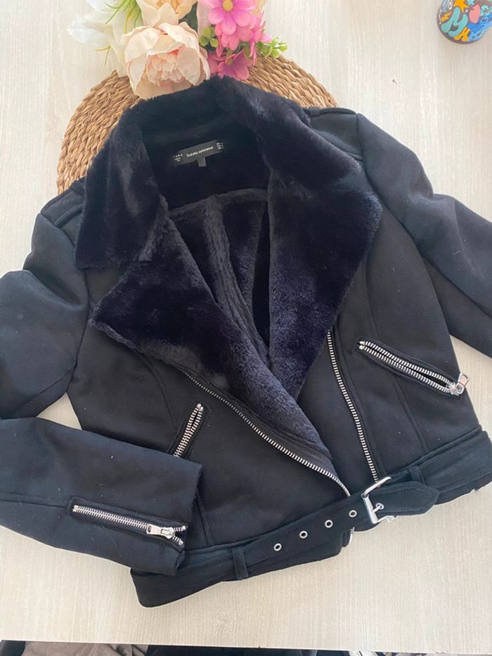 Manteau type perfecto en matière type daim / suédine. Intérieur fourré molletonné Xs