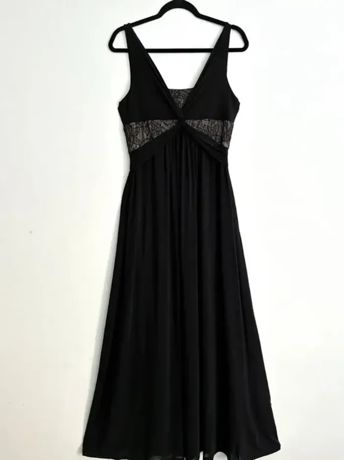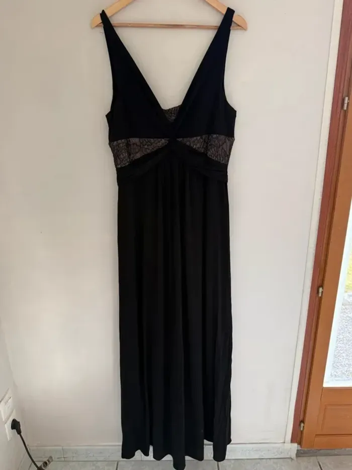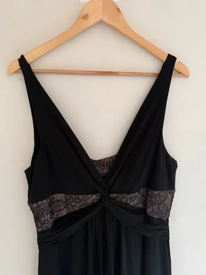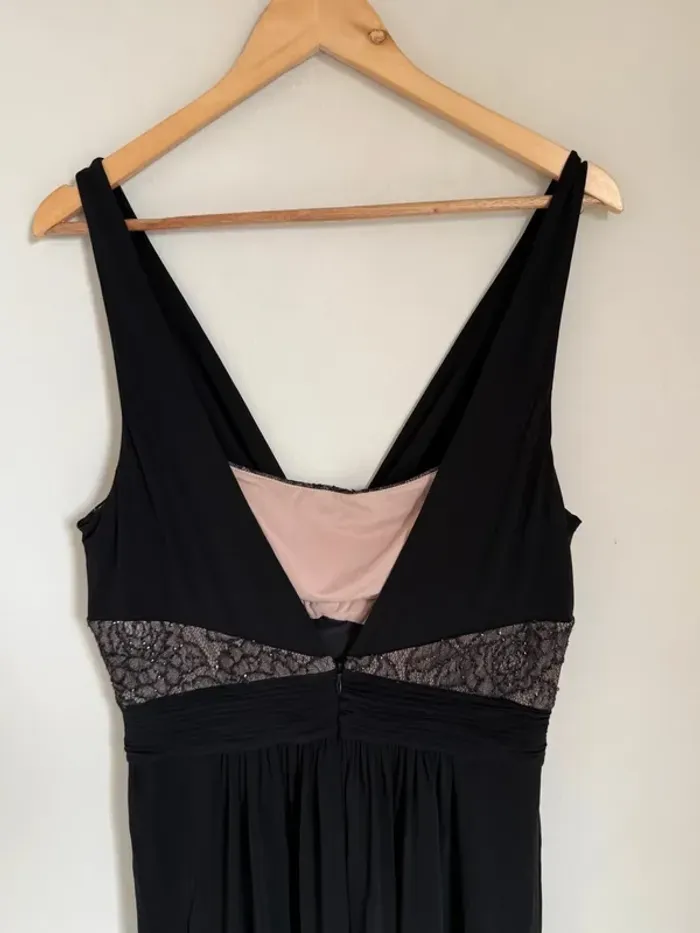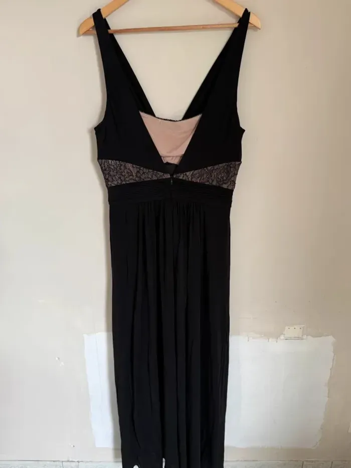 Robe de soirée longue à bretelles BCBG MAXAZRIA noire Détails dentelle noire et nude avec perles Bandes croisées sous la poitrine Taille L Excellent état Maxi Formal Dress W/ Tan & Black Lace