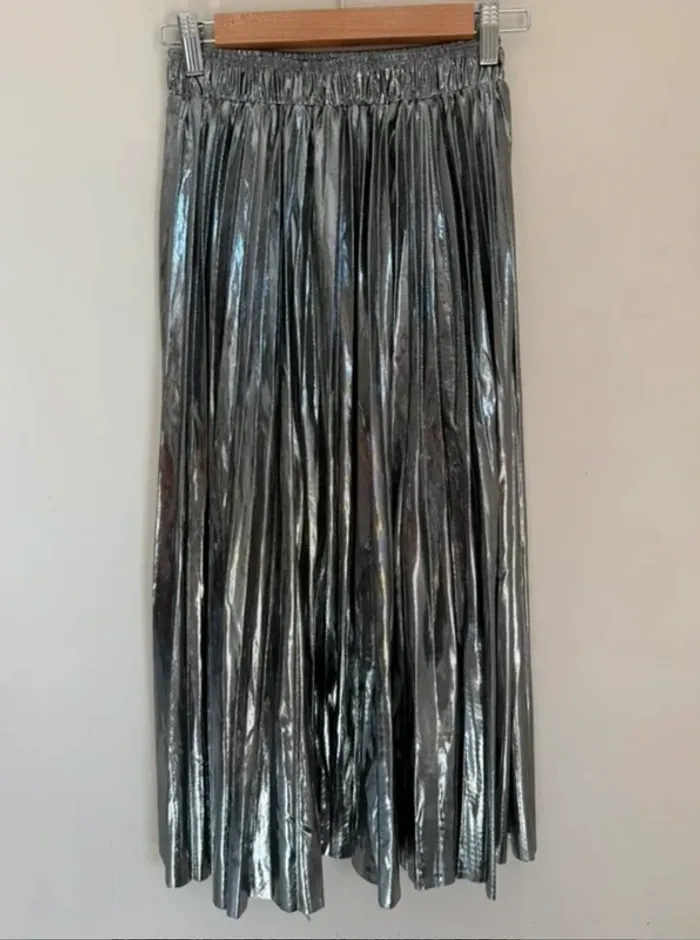 Jupe plissée argentée mi longue Élastique à la taille Longueur 80cm taille S État neuf ——————————— Cette pièce appartient au dressing de Thérèse. ✨ Je suis #Reusse, revendeuse professionnelle de seconde main. Thérèse m'a confié les vêtements qu'elle ne porte plus pour les vendre à sa place. Intéressé par le service ? Contactez-moi.