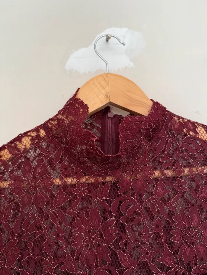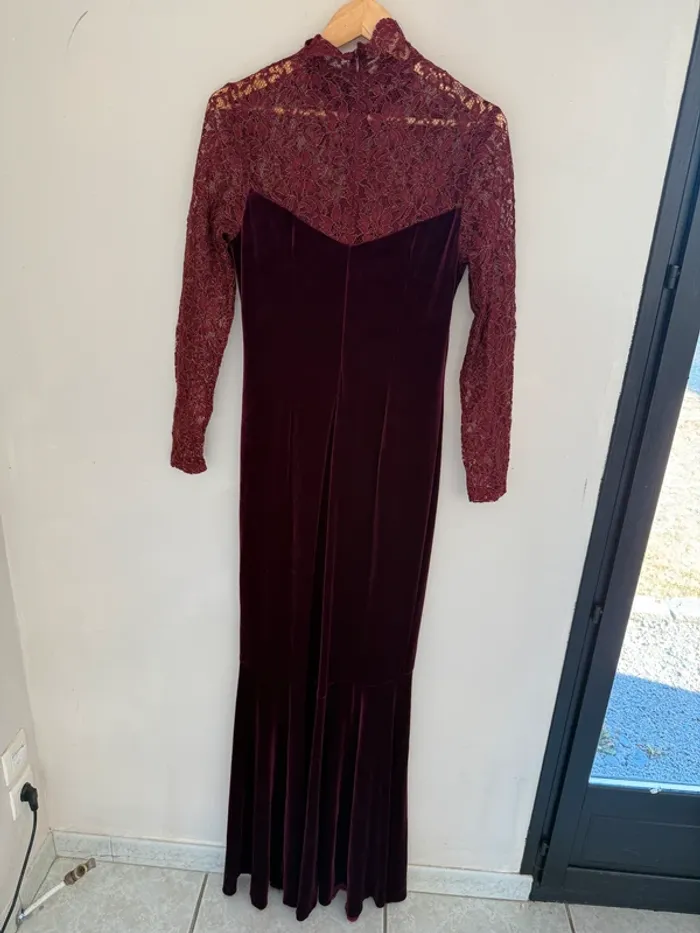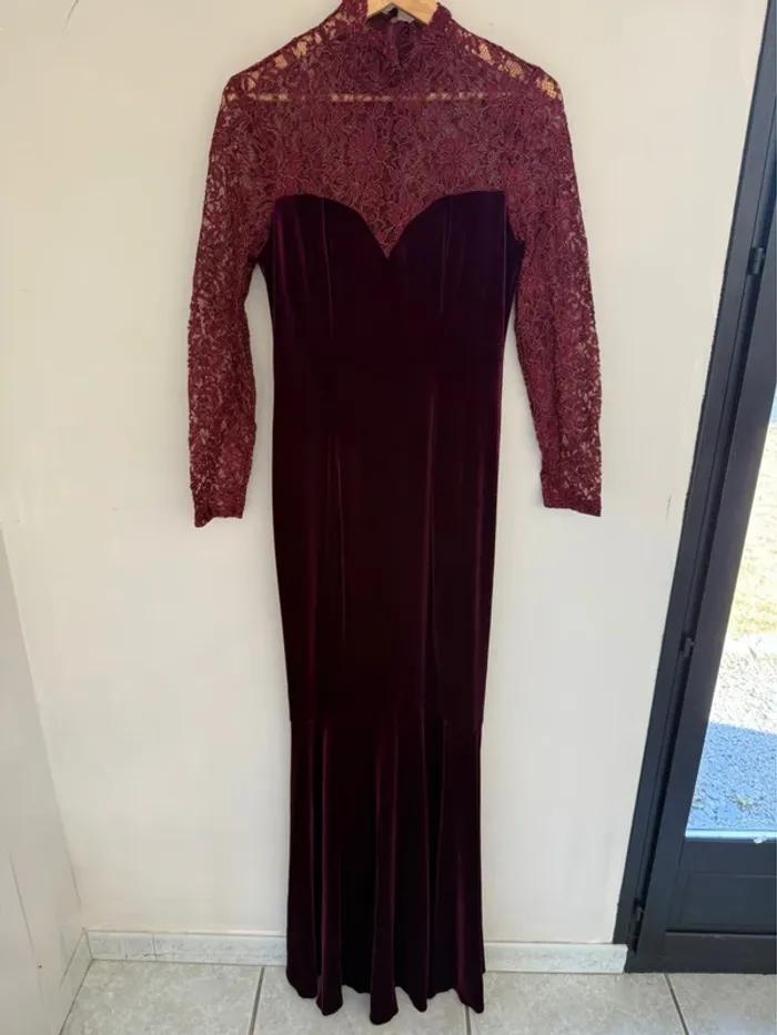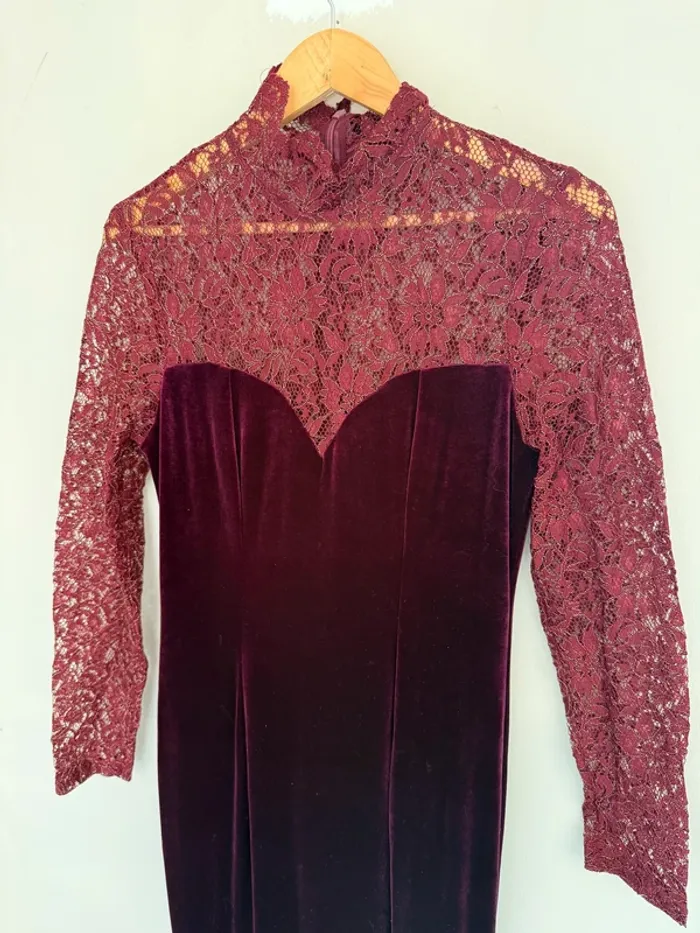 Robe longue en velours bordeaux Haut du buste & montant en dentelle brillante Col montant Taille L Très bon état