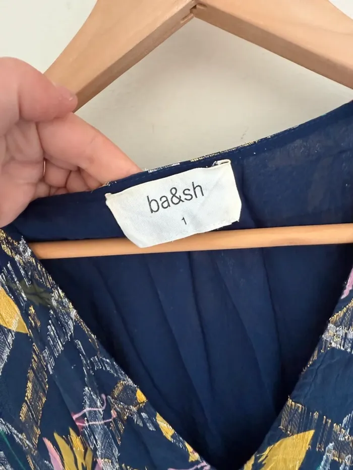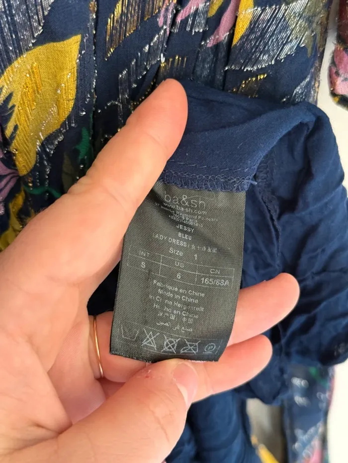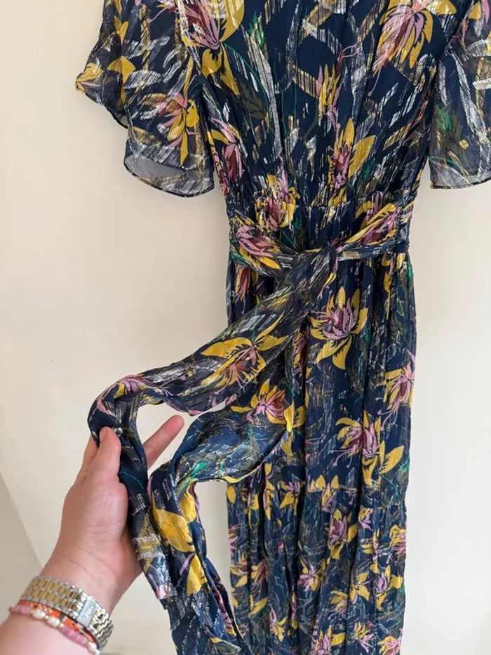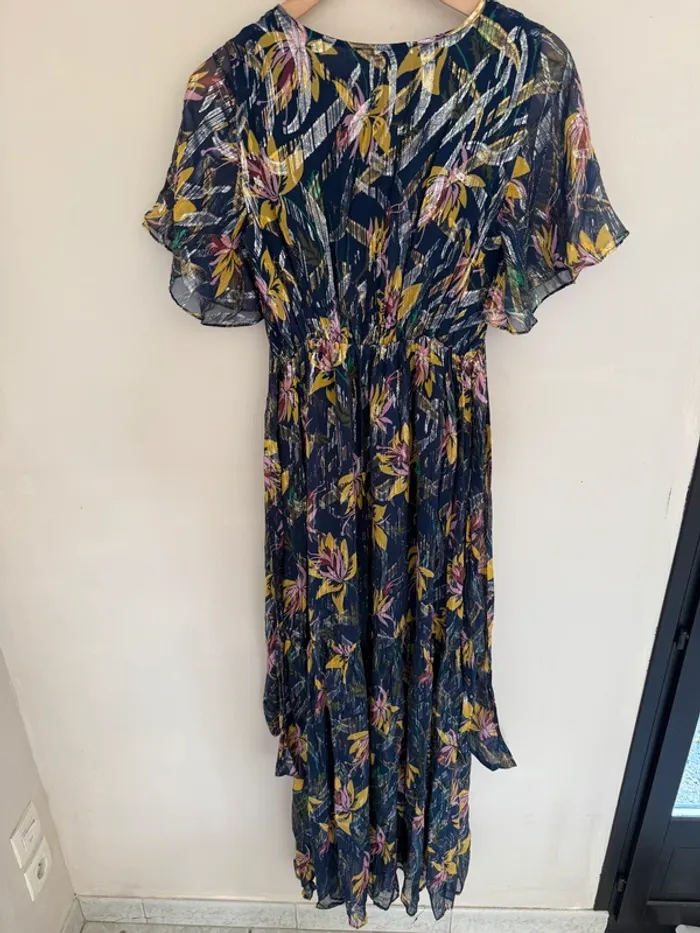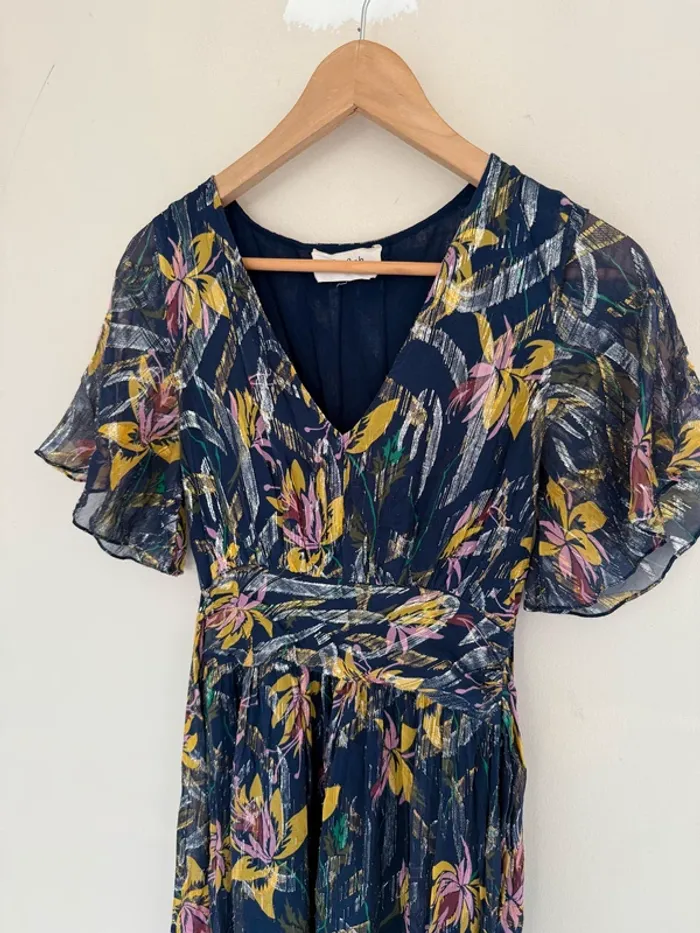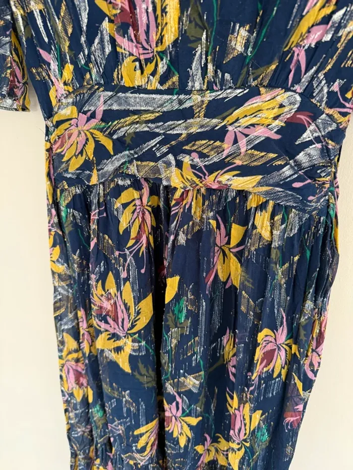 Robe longue ba&sh Jessy bleu Bleu marine imprimé floral rose et jaune Touches métalisées Taille 1 Excellent état 74%SOIE 26%FIBRE METAL - Doublure: 100% VISCOSE