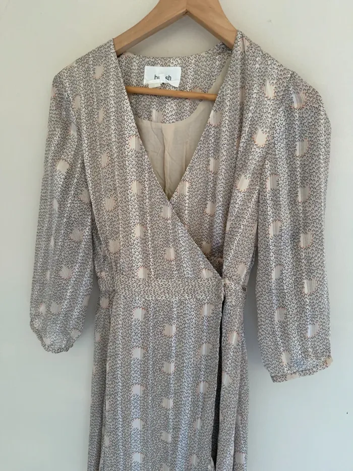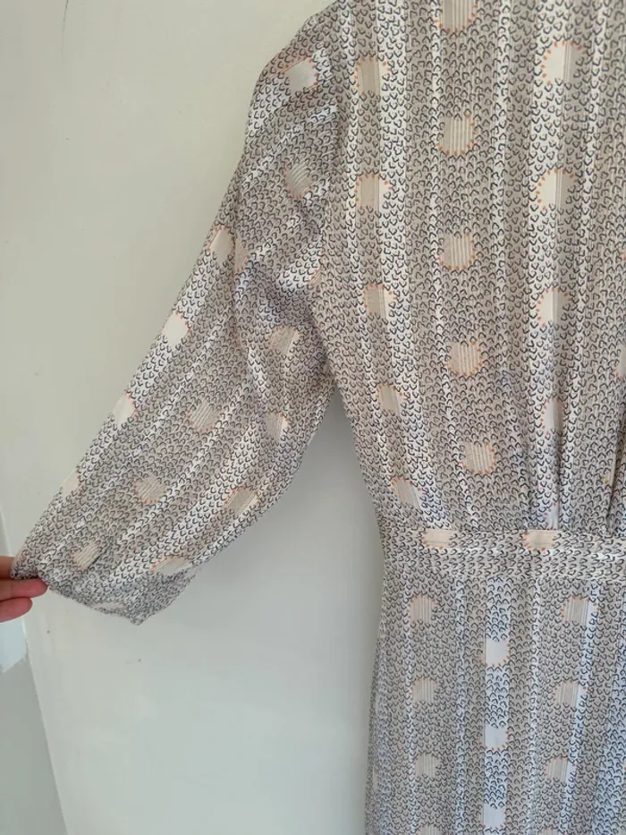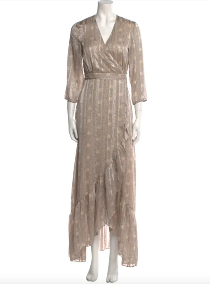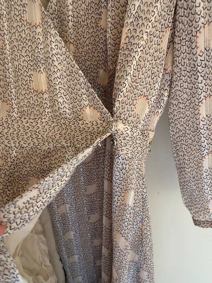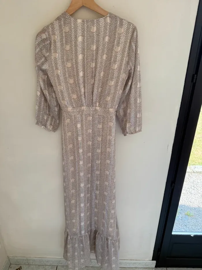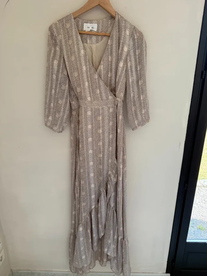 Robe longue Pisy ba&sh T.1 Couleur beige /écru avec imprimés Excellent état Robe Forme portefeuille forme asymétrique Manches 3/4 Col esprit cache cœur Imprimé En bas : finition volant À volants et fil métallisé; sku: 1H19PISY