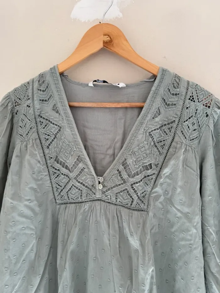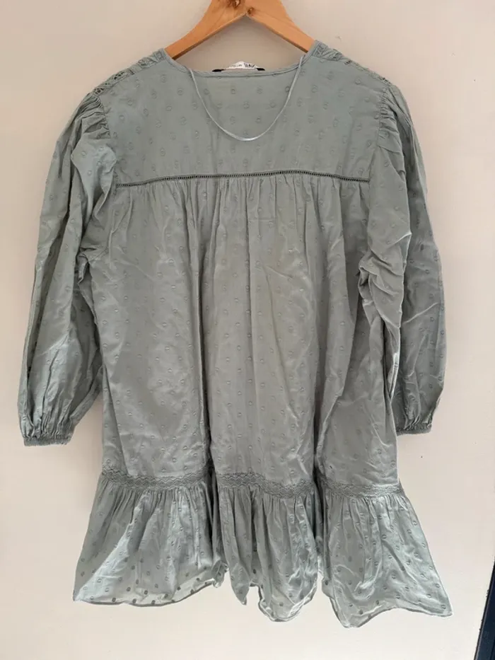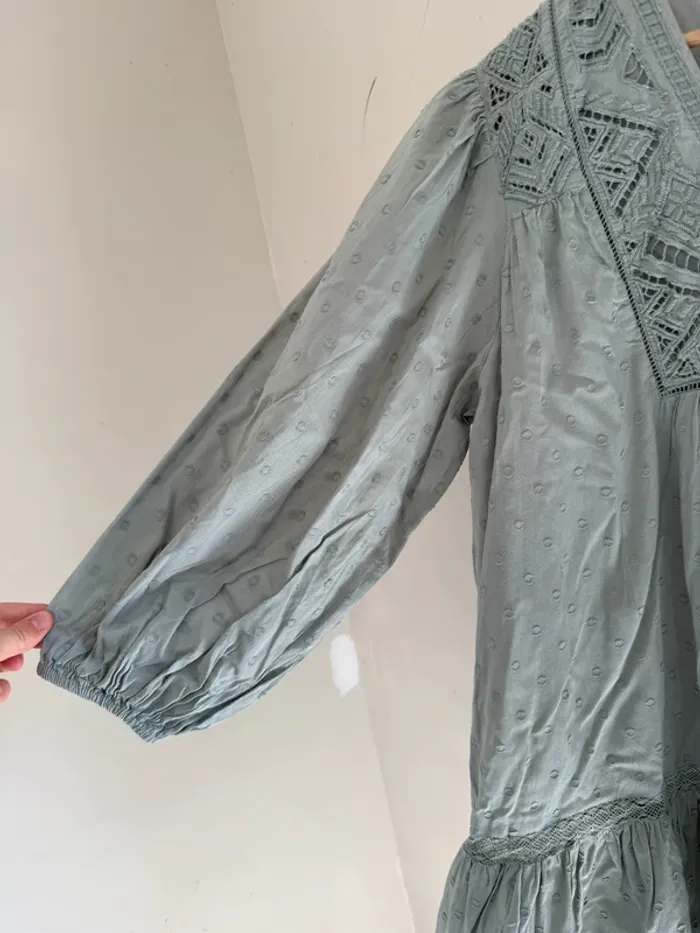 Robe Zara vert sauge Manches bouffantes Détails broderie & plumetis taille L Très bon état