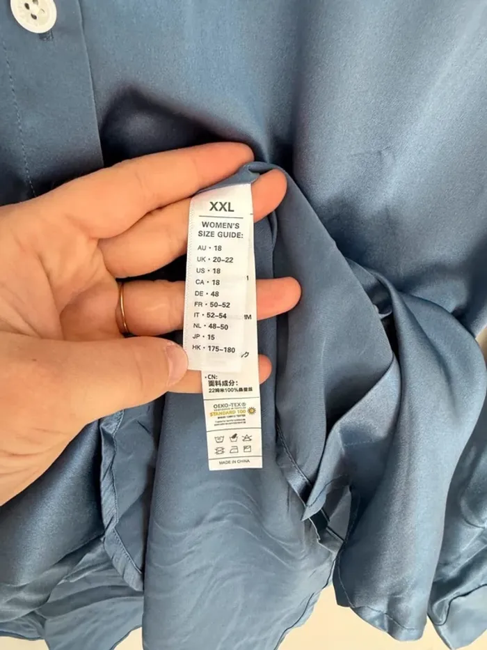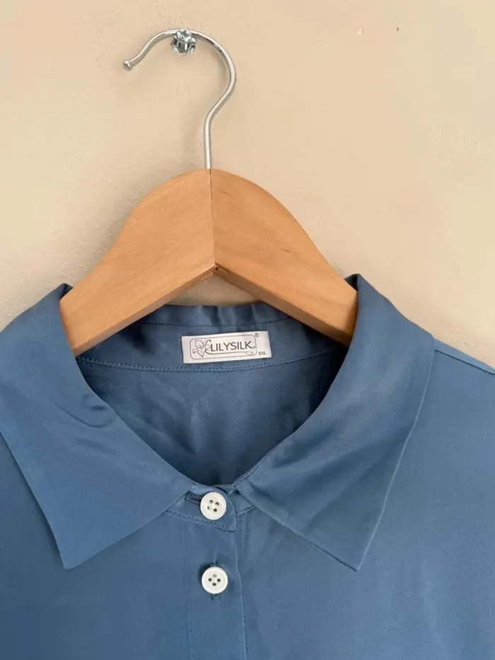 Chemise Lily Silk Modèle phare : chemise en soie classique intemporelle Couleur bleu 100% soie naturelle Taille XXL Excellent état Cette chemise à manches longues avec une patte de boutonnage ouverte est classique, et la proportion de cette version est plus mince et raffinée, ce qui convient au lieu de travail nécessitant un style plus soigné.