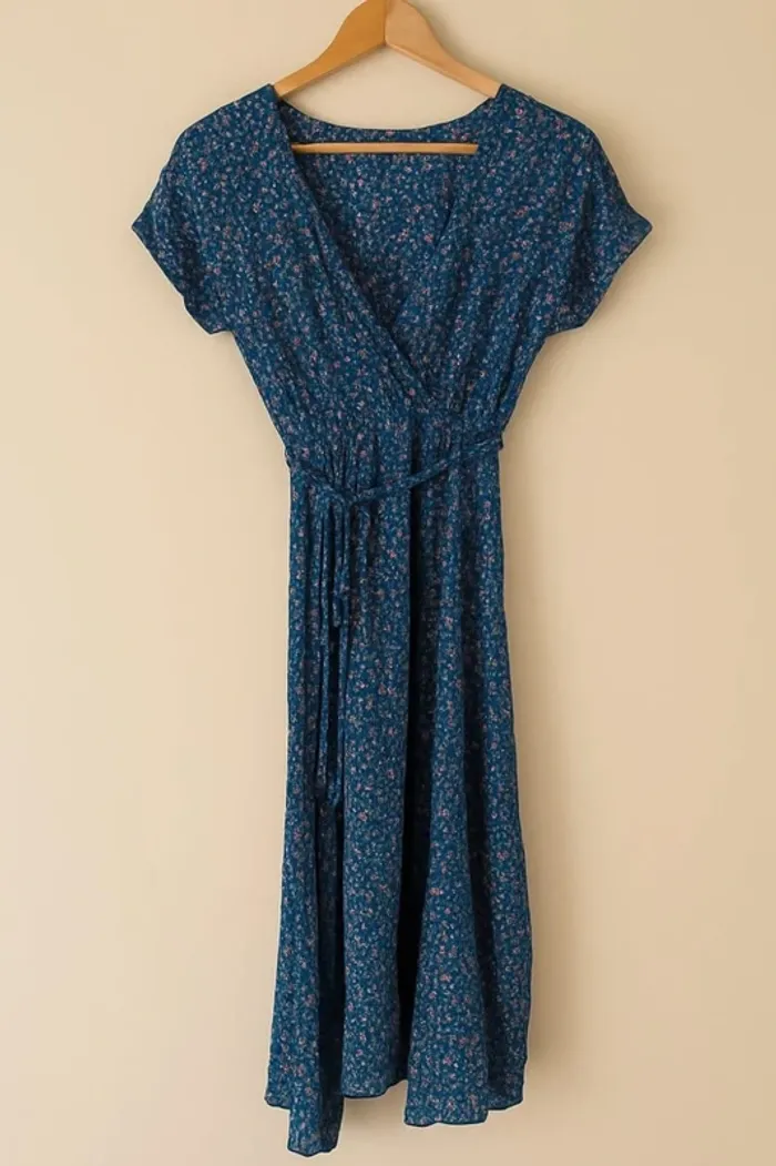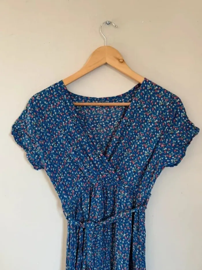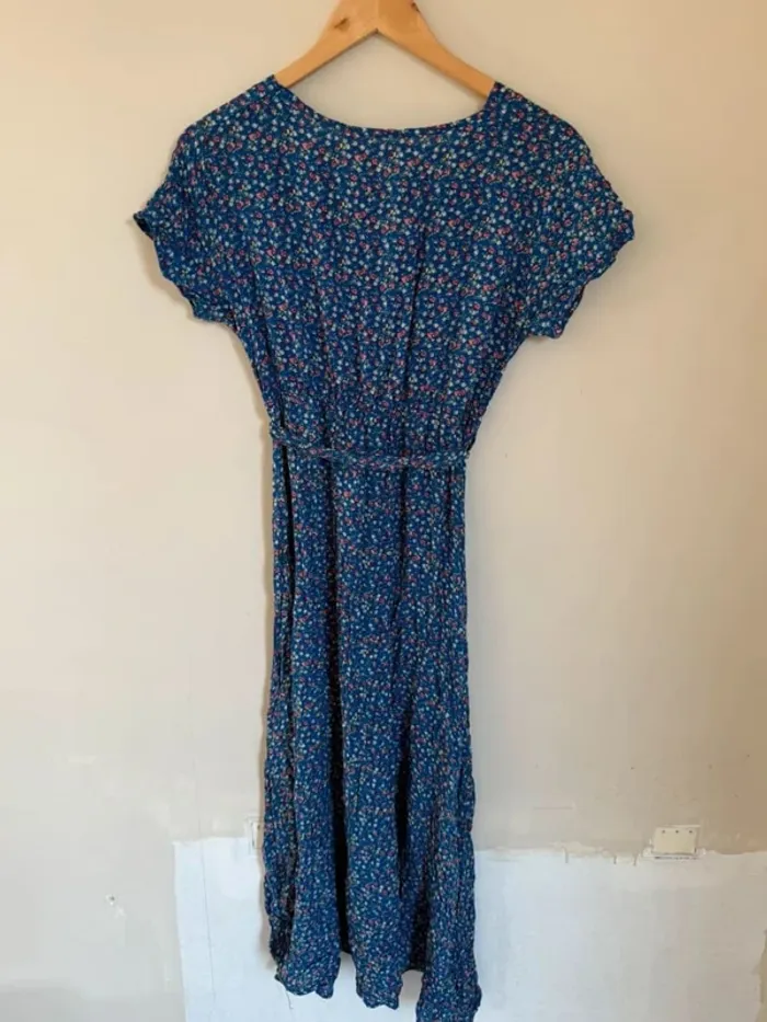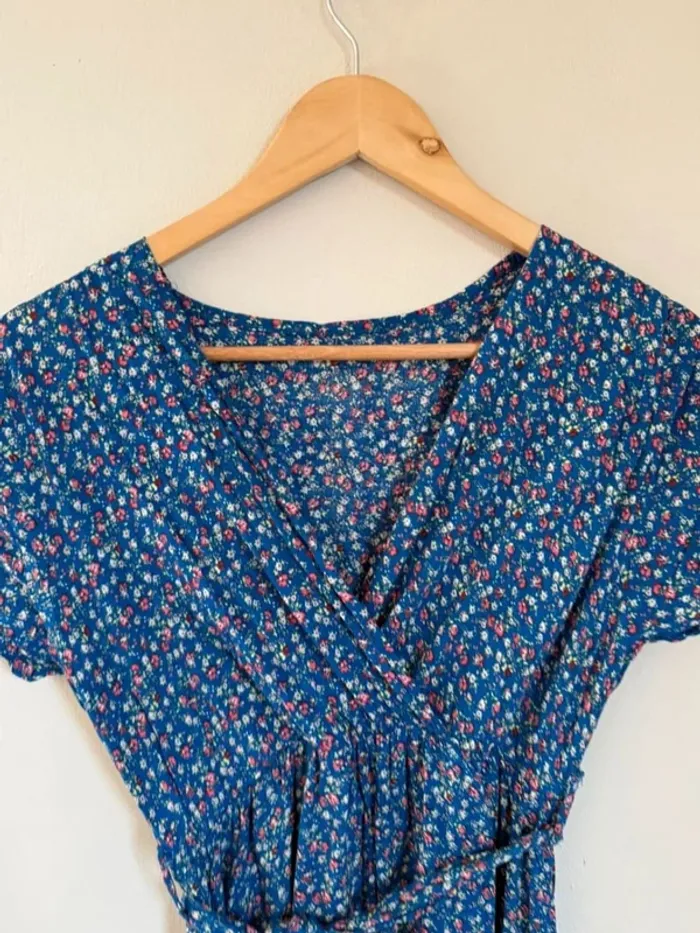 🌸 Robe longue fluide bleu à fleurs – Taille unique (ok S/M)🌸 Superbe robe légère et fluide, parfaite pour le printemps et l'été ! Couleur : Bleu avec imprimé fleuri (petites fleurs rouges, blanches et roses) Coupe : Style portefeuille croisé, taille élastiquée avec lien à nouer Manches courtes volantées, longueur mi-mollet Matière douce et confortable, agréable à porter État : Très bon état, portée seulement quelques fois, aucun défaut. Sans marque