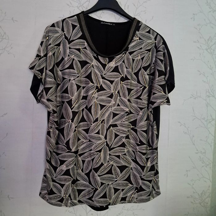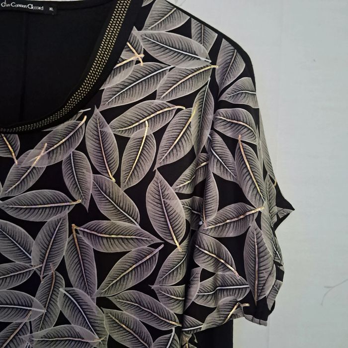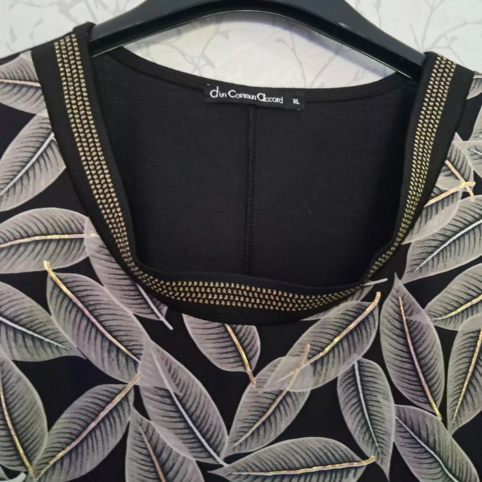Col arrondi avec bandes or brillantes A feuilles centre brillant doré Manches chauve souris 56 cm d’aisselle à aisselle 65 cm de longueur