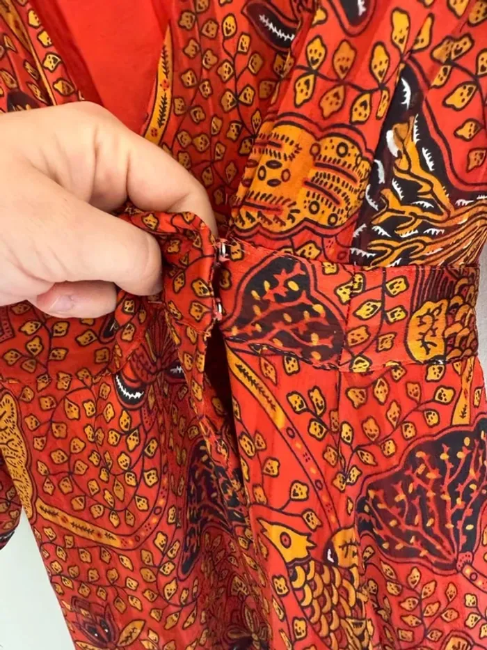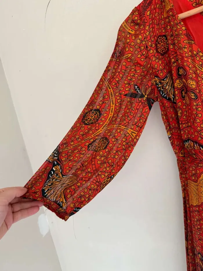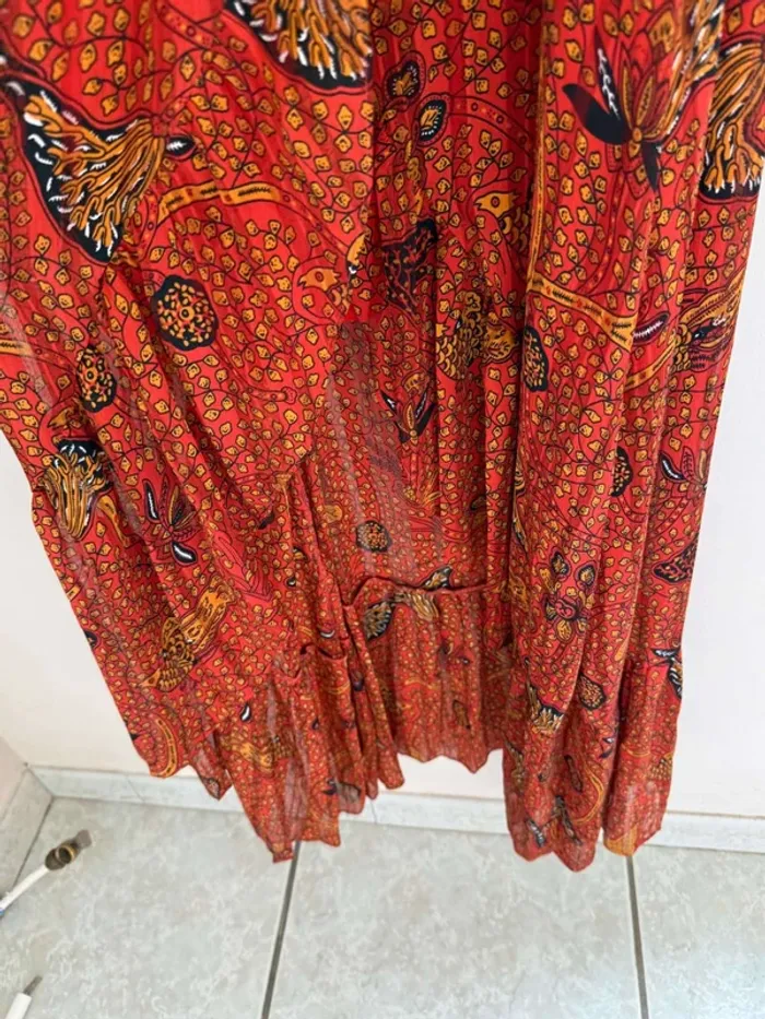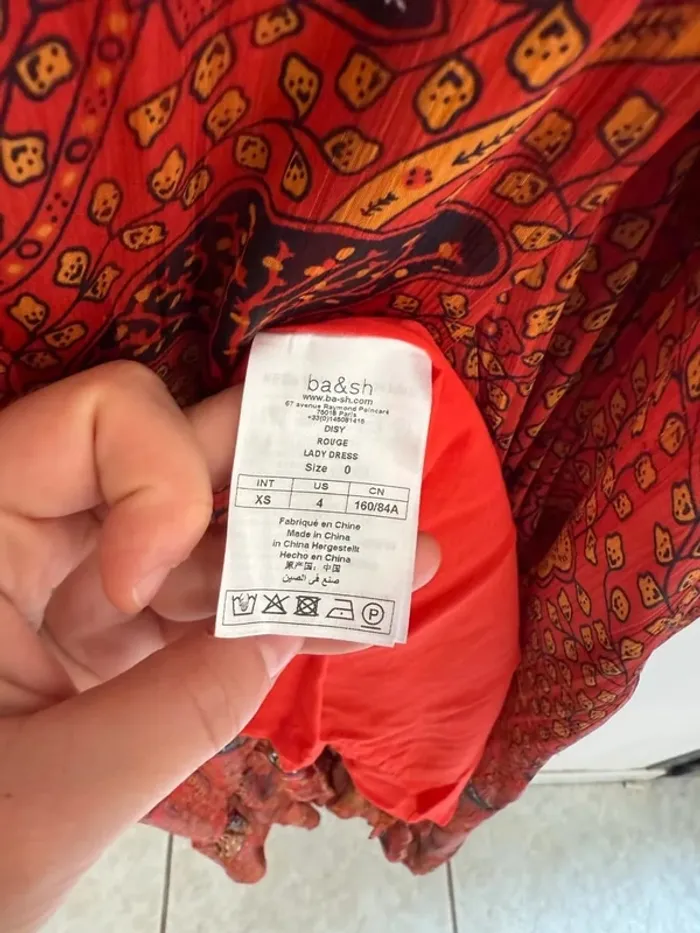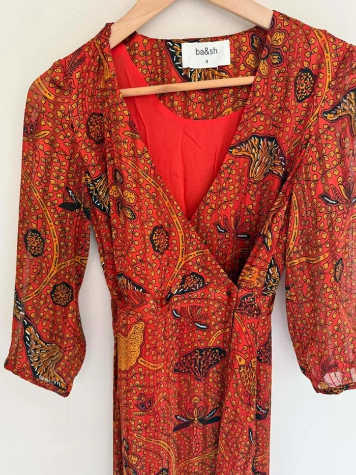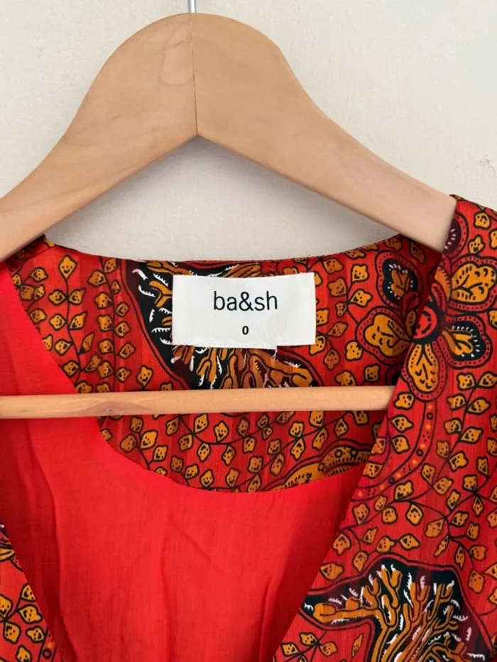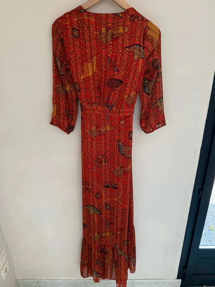 Robe longue Disy orange ba&sh taille 0 Très bon état Cette robe longue ba&sh se distingue par sa matière légère et son imprimé chatoyant. Très féminin, le vêtement dispose d'une encolure cache coeur dessinant un joli V, de manches 3/4, d'un large volant asymétrique en bas de robe qui joue la transparence. Une maxi robe parfaite avec des bottines. Robe longue Manches 3/4 Encolure cache coeur 100% polyester; sku: 1H18DISY