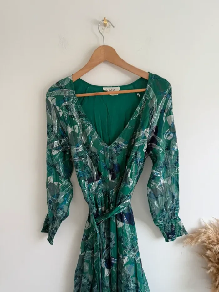 Robe longue Jasper verte ba&sh Verte imprimé floral bleu et blanc avec fils métallisés Ceinture à boucle en tissu Taille 2 (je vends la même en taille 1) Très bon état Cette robe longue en soie ba&sh se pare de coloris éclatants rehaussés de fils brillants pour illuminer votre dressing d'hiver. Le vêtement dispose d'un col en V et de manches longues smockées en bas. Une ceinture à boucle ronde recouverte vient souligner la taille. La robe imprimée est fendue haut sur la jambe. On note les jeux de transparence sur le bas des manches et de la jupe. Une robe maxi féminine et joyeuse ! Robe longue Col V Manches longues Ceinture 74% soie, 26% fils métal; sku: 1H18JASP