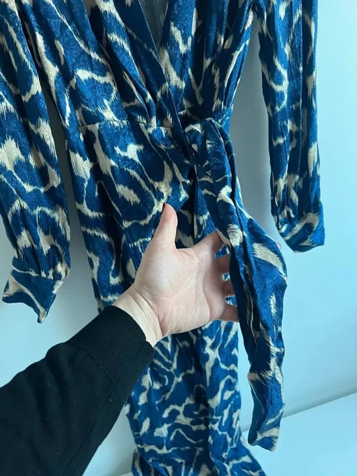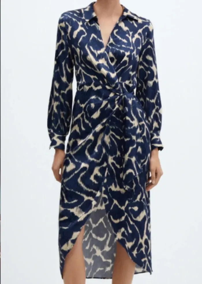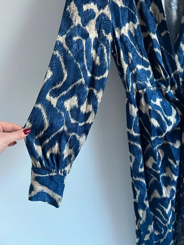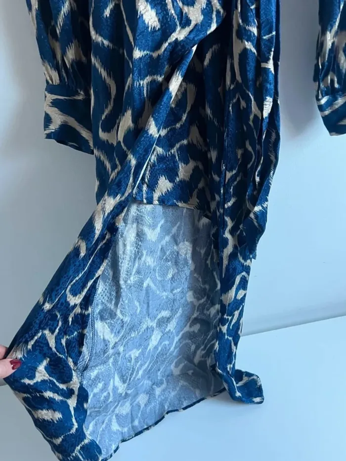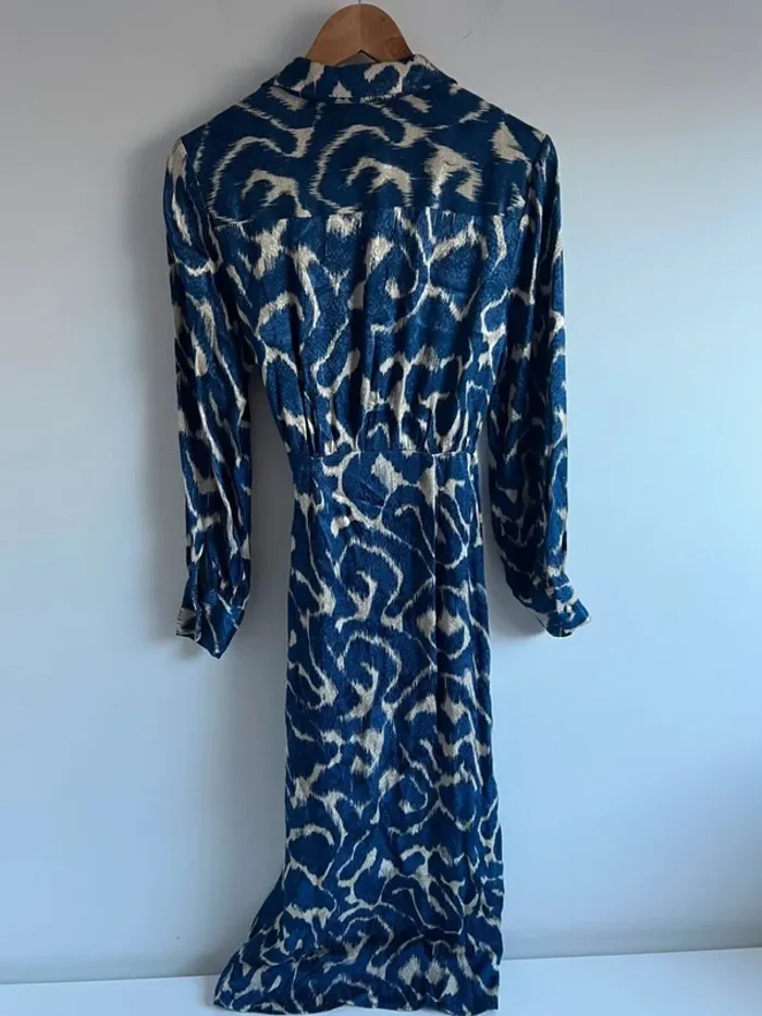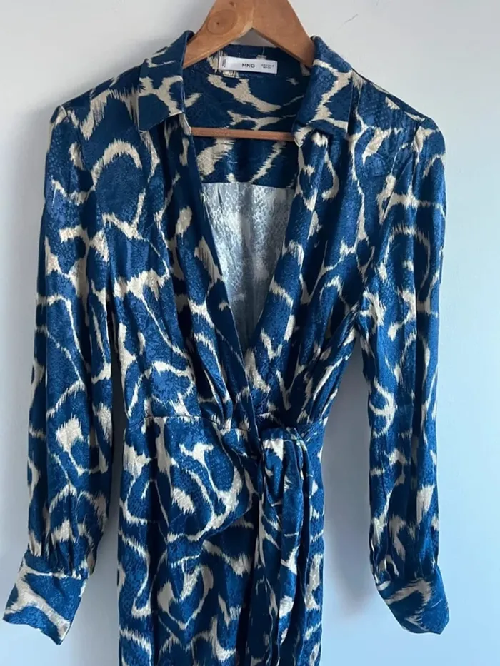 Robe longue motifs bleus et crème Mango Effet satiné Manches longues Fermeture cache-coeur + noeud à la ceinture Taille S Portée une fois, excellent état