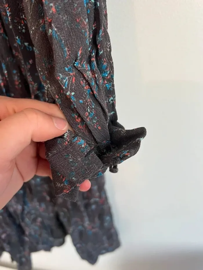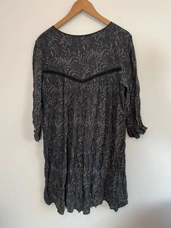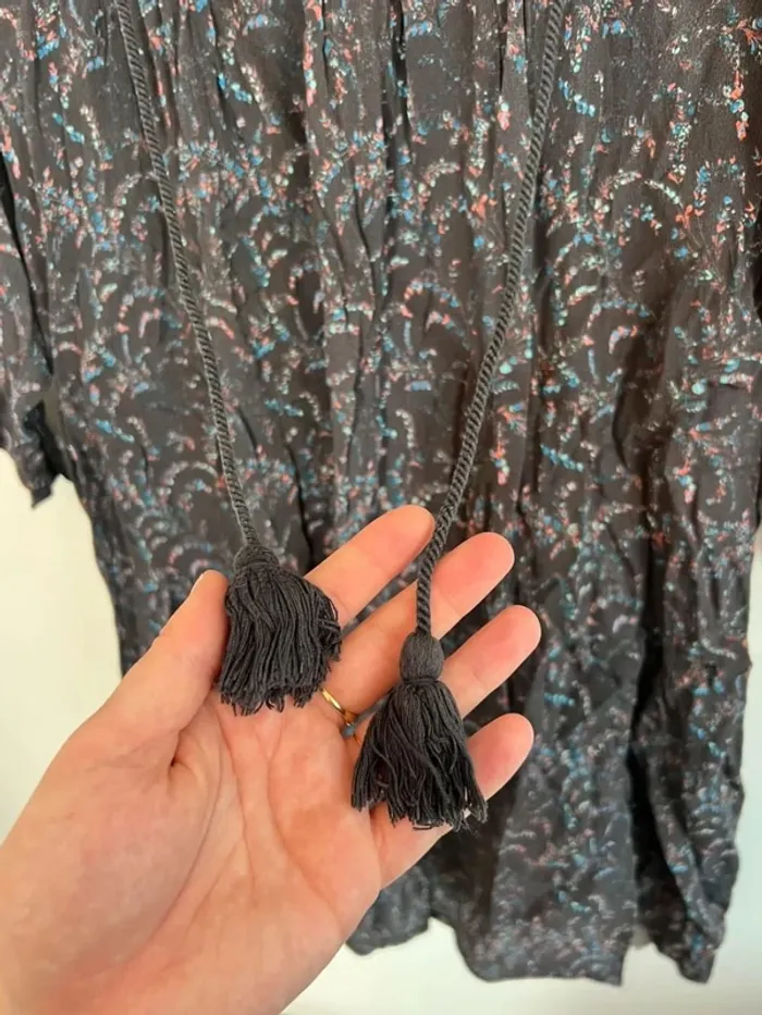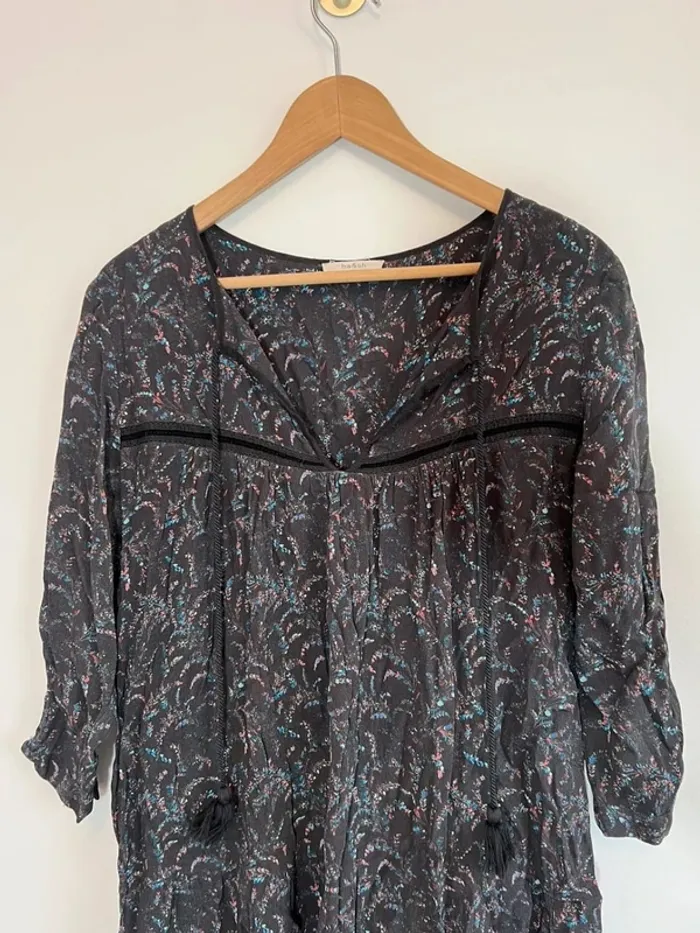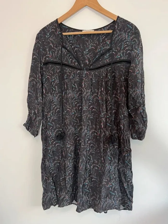 Robe courte ba&sh Grise foncé avec imprimé bleu et rose Doublure Cordons pompons Taille 2 Très bon état général mais : - il manque un bouton sur la manche - un petit trou au niveau de la broderie dans le dos