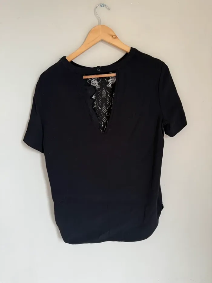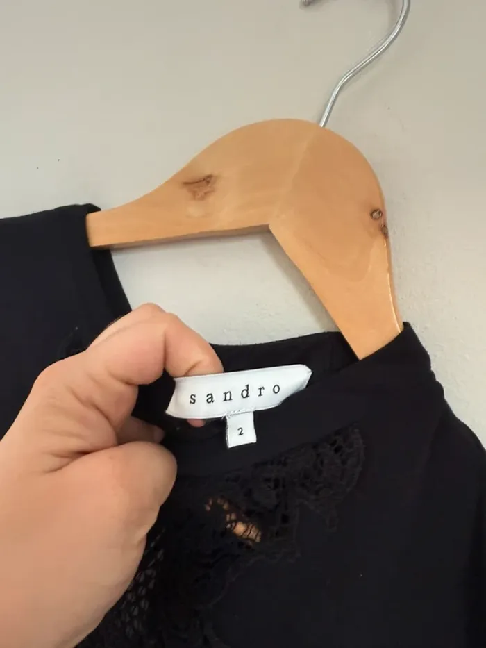 Blouse noire manches courtes Sandro Décolleté sous broderie Taille 2 Très bon état