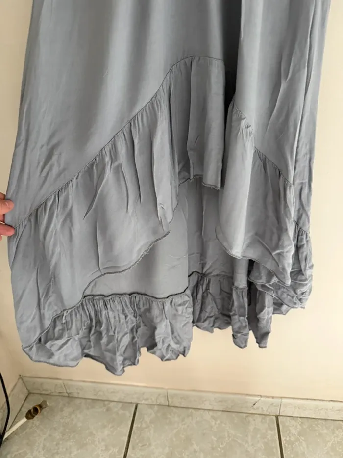 Robe longue gris perle New Collection Manches courtes volants Plus courte sur l'avant volant en bas 100% sur l'avant Taille 2 Très bon état