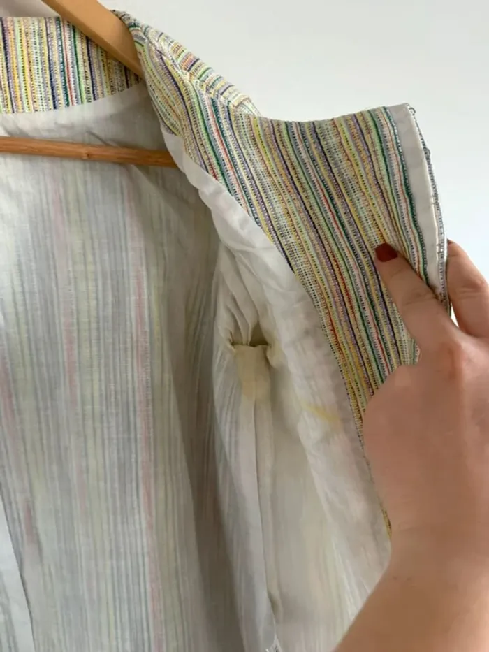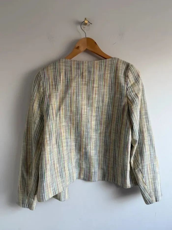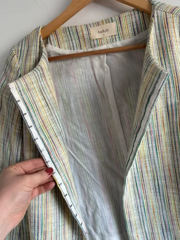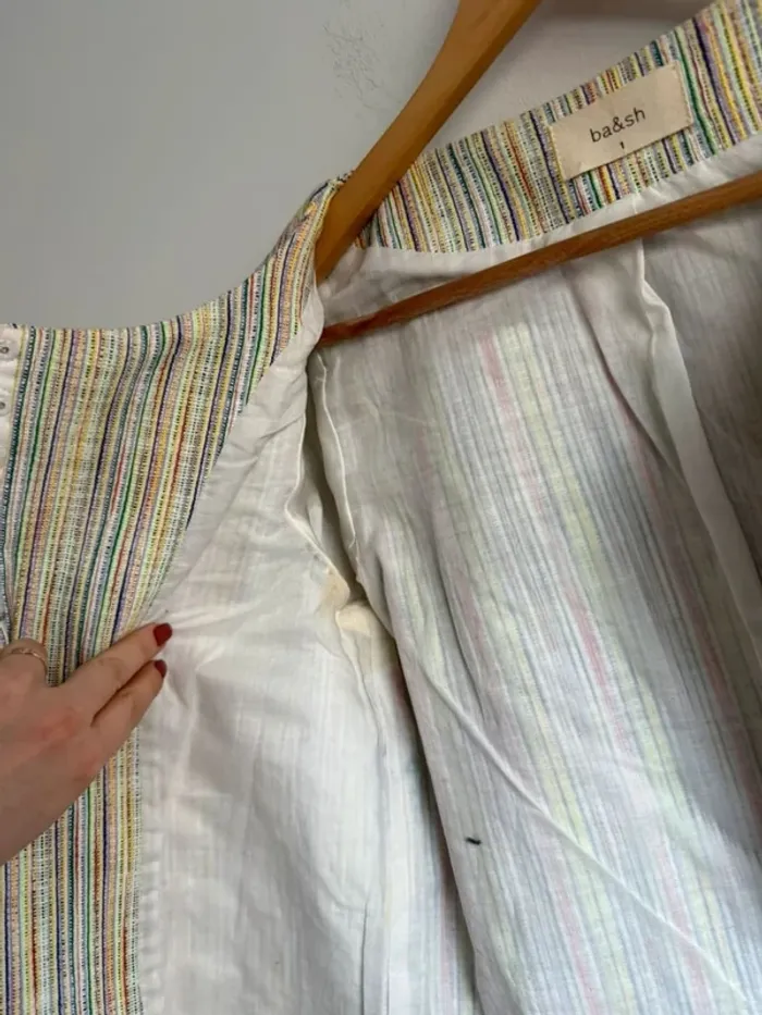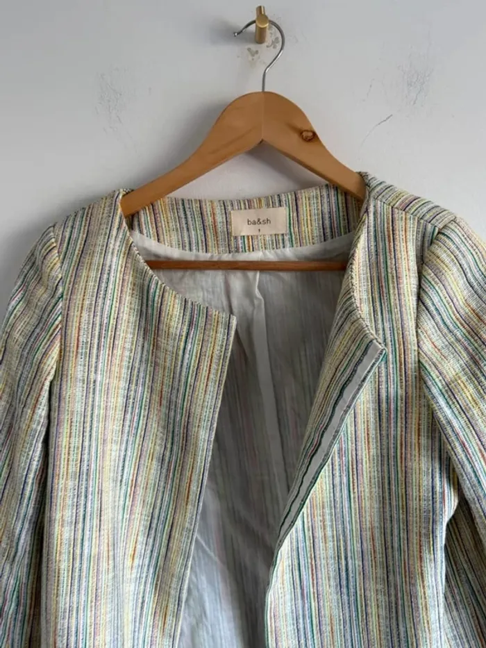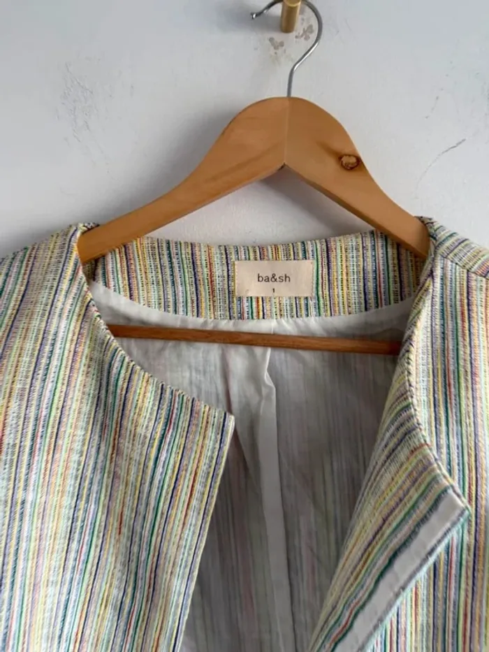 Veste blazer court Ba&sh Modèle Léa Multiples rayures multicolores Dans les tons beige vert sauge Taille 1 Excellent état extérieur, intérieur sous les aisselles jaunis doublure à refaire enventuellement