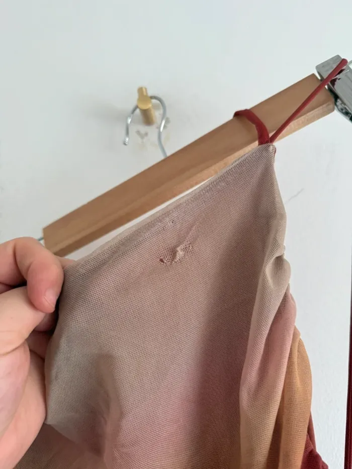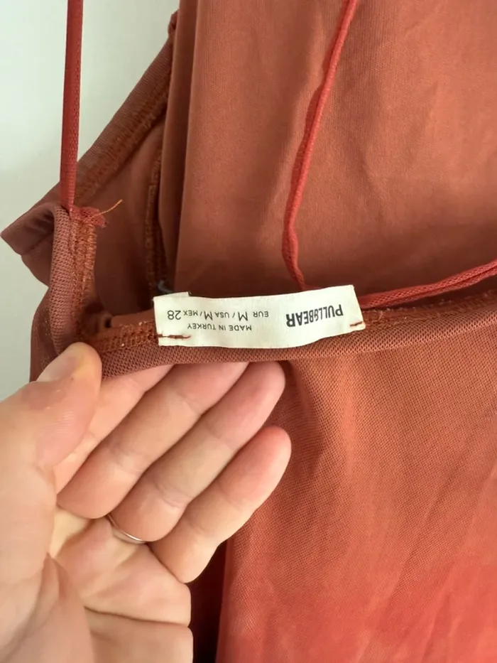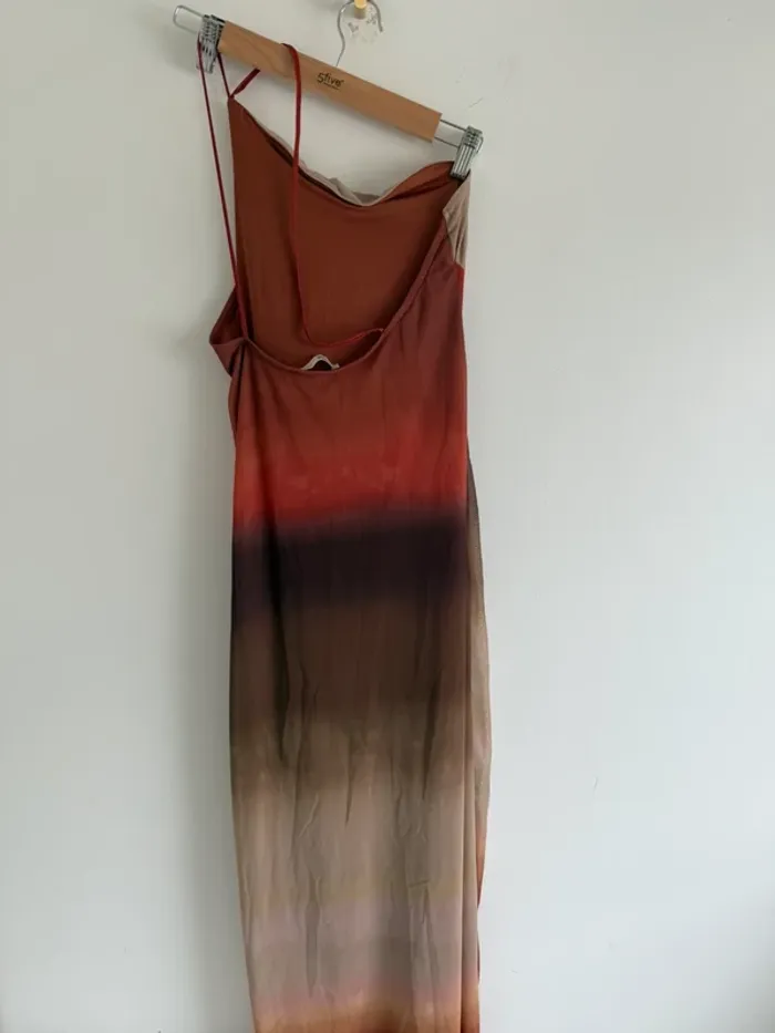 Robe longue asymétrique Pull&Bear 1 bretelle et côté bustier Dégradé de couleur : rouge rouille, terracotta, noir, marron, beige... Matière texturée style résille, doublure Taille M Bon état, un accroc sur l'avant