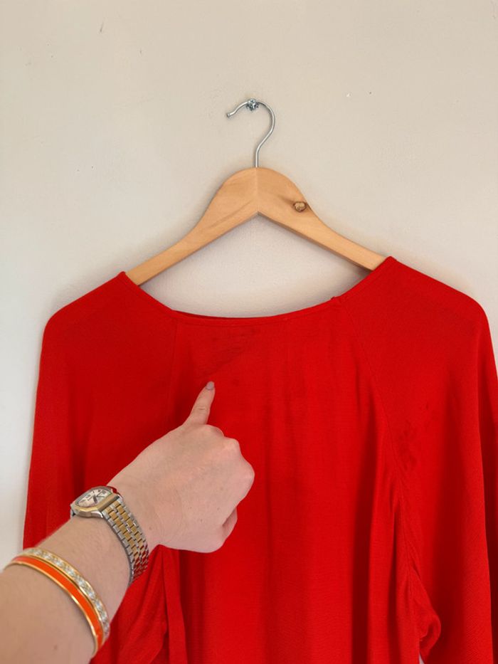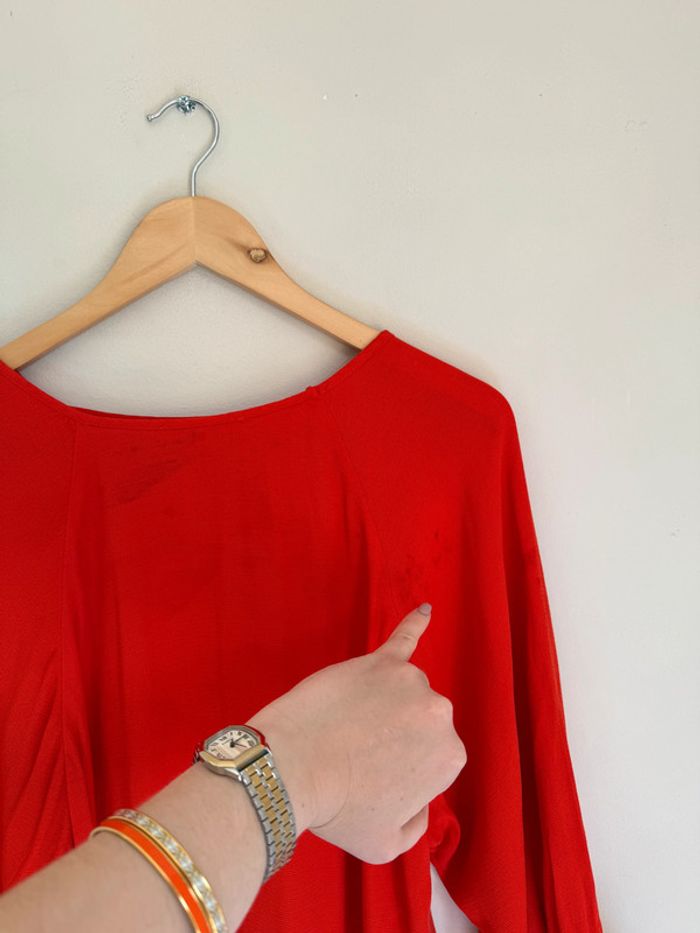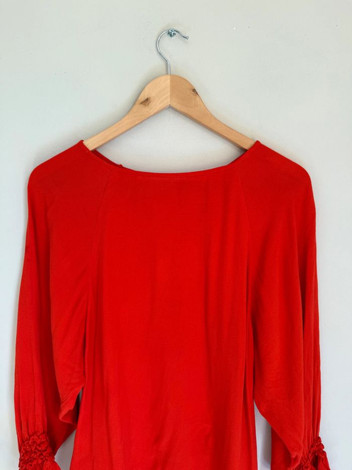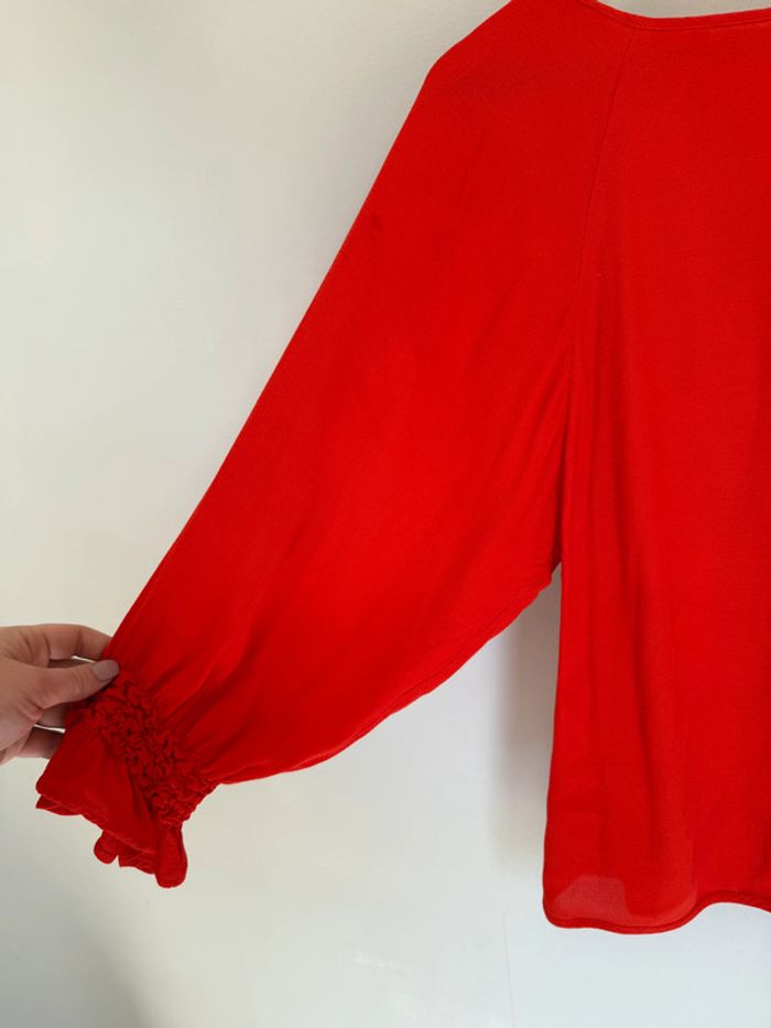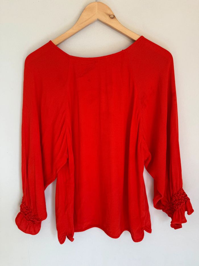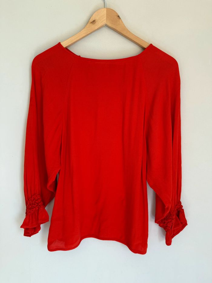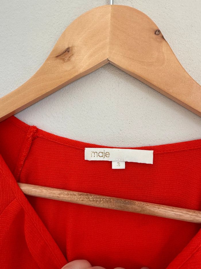 Blouse fluide Maje rouge Manches longues fronces aux poignés Taille 3 Bon état, des tâches dans le dos à retirer