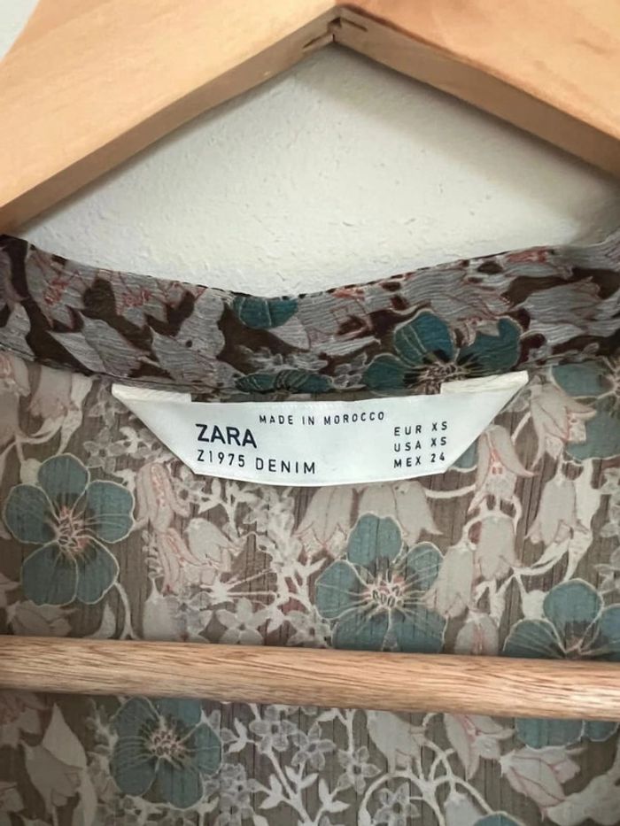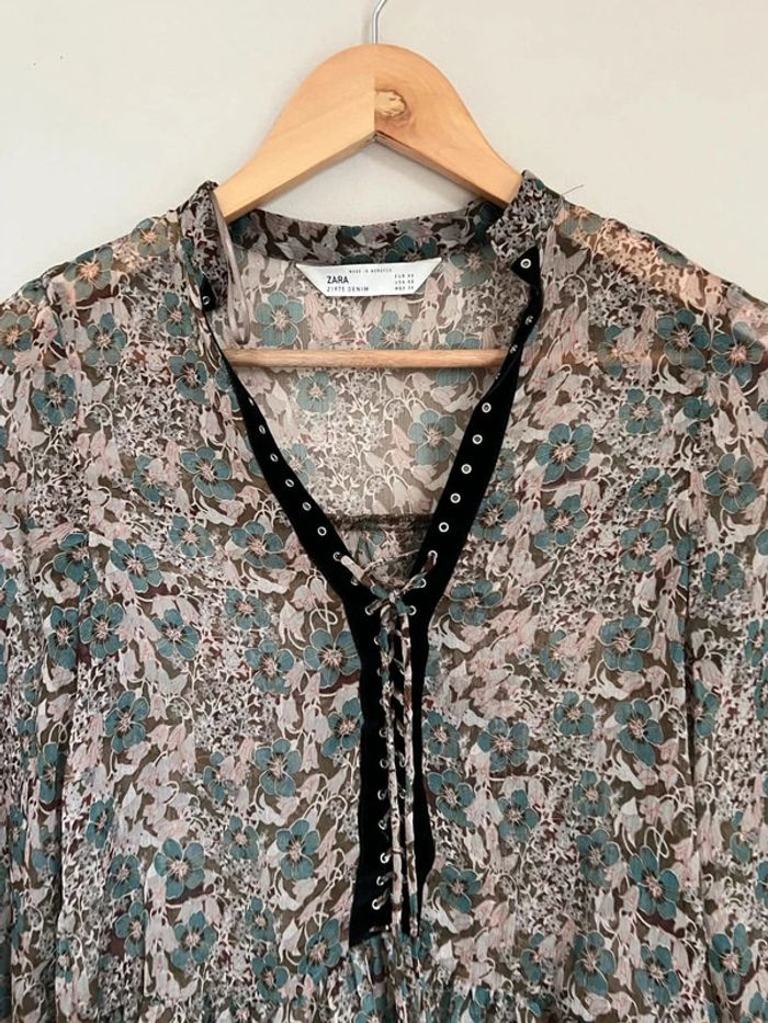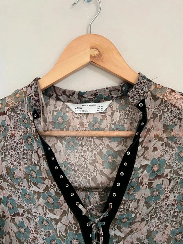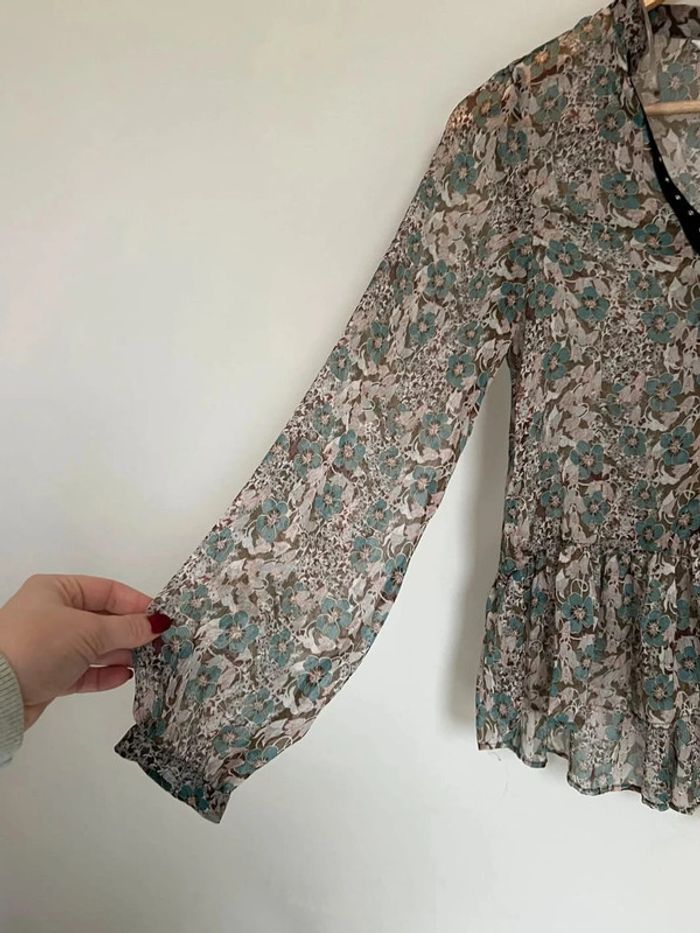 Blouse transparante rose à fleurs vert / bleu turquoise Col en velours noirs avec oeillets argentés Taille XS Très bon état