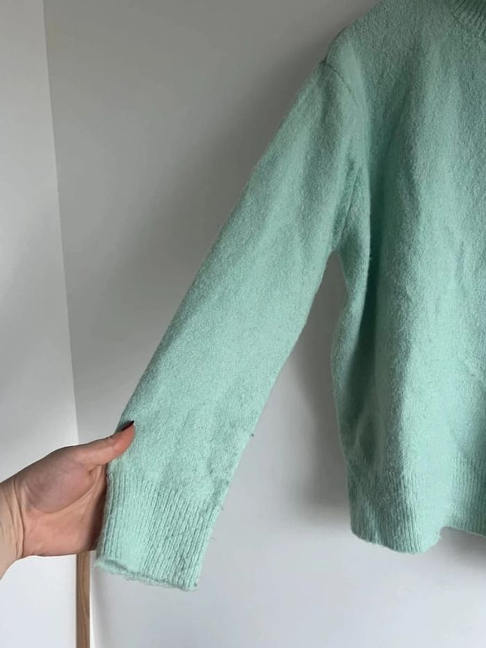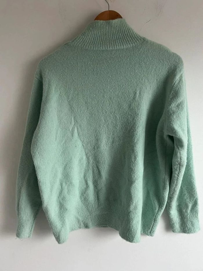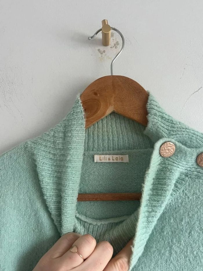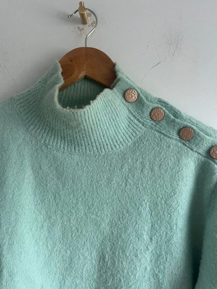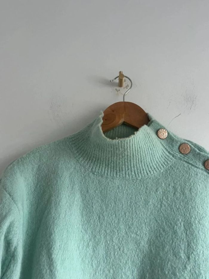 Pull vert menthe à l’eau col cheminée montant Boutons dorés sur l’épaule Taille unique Porté, un peu bouloché