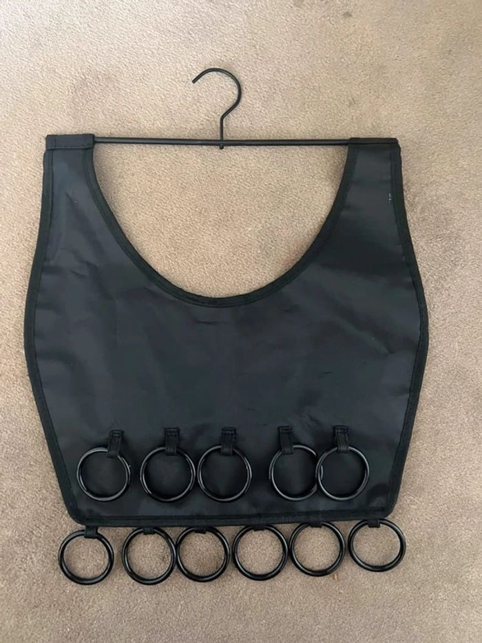 Système de rangement pour foulards, bandeaux, ceintures Cintre pour penderie avec 11 anneaux Une fois les anneaux remplis le rangement ressemble à une robe Vendu sans les foulards